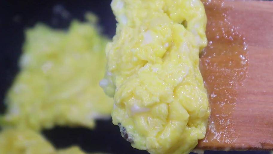 3、油热放入葱末炒出香味,然后淋入鸡蛋液,中小火翻炒,把鸡蛋炒成这样湿润嫩滑的状态,不要炒老了,那样就不好吃了。