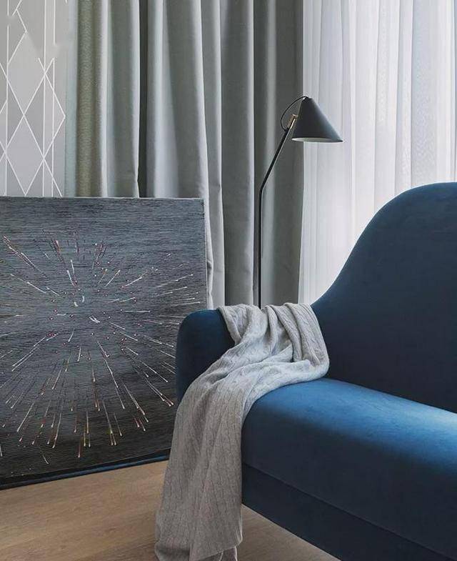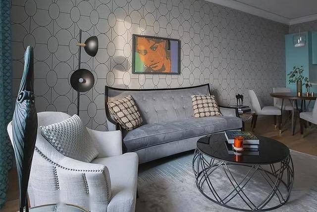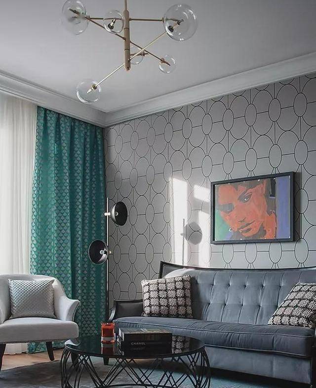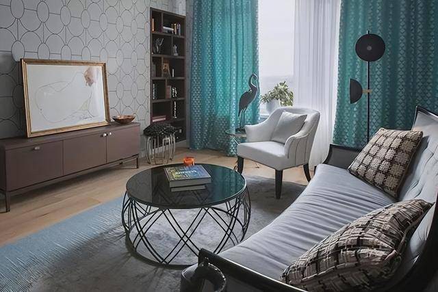 ▲客厅以浅灰色作为主色调,低调的几何墙纸突显了墙面的装饰画。柔和、流畅的沙发线条与圆形茶几起到呼应关系。绒面与铆钉让沙发显得更精致、时尚。绿松石色的格子窗帘除了让空间变得时尚外还增添了生命力。