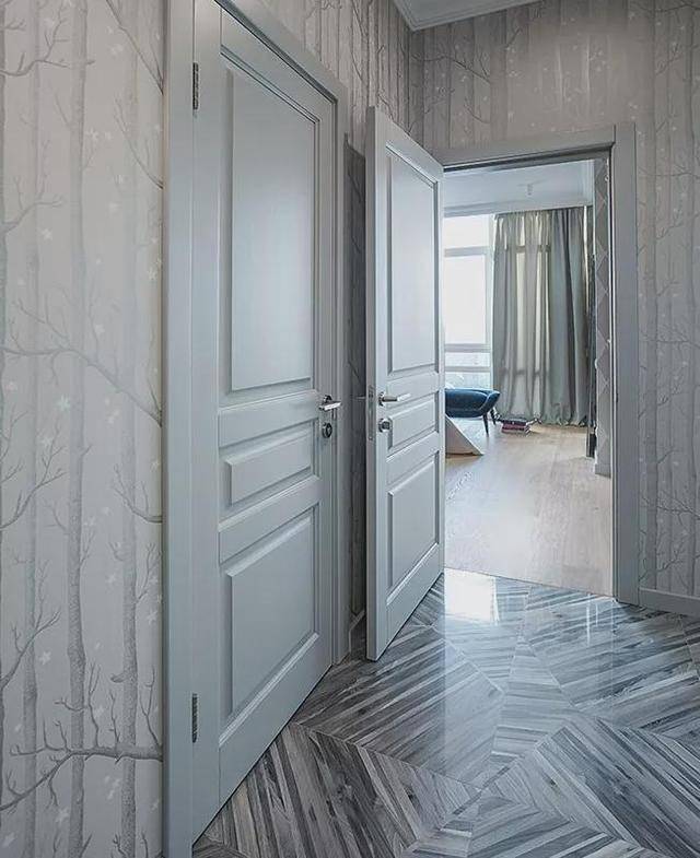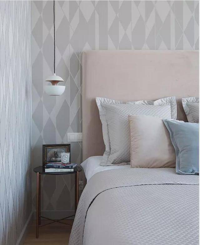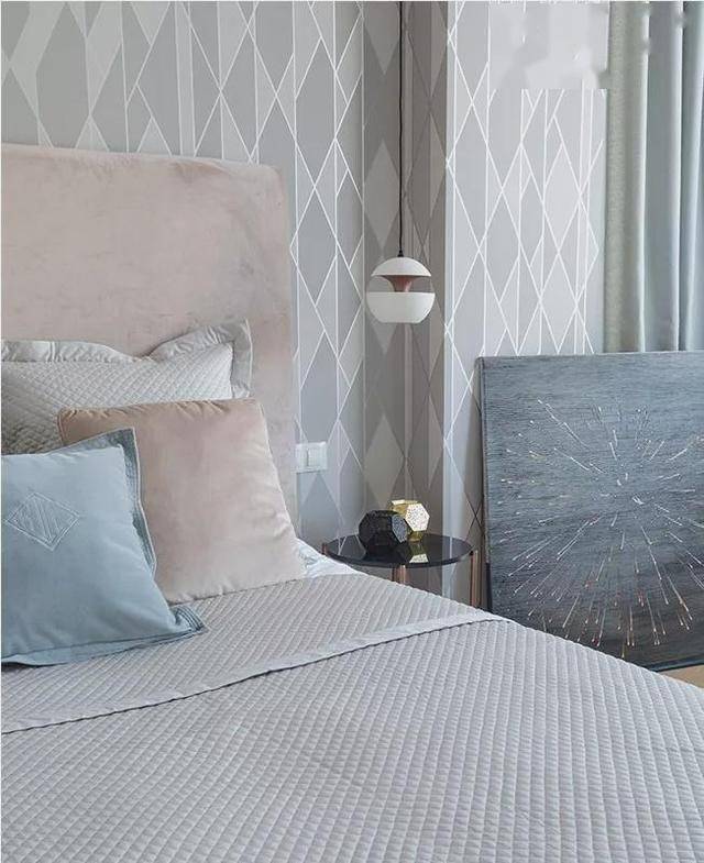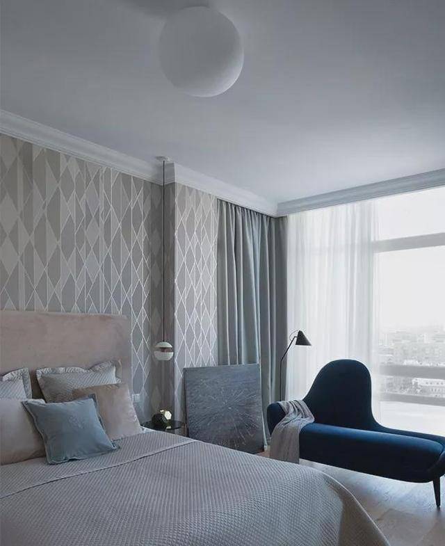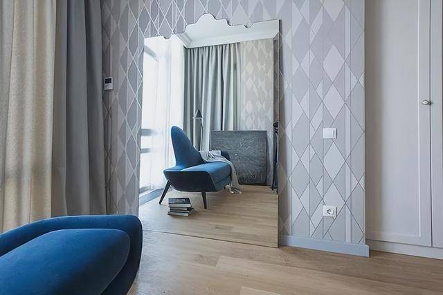▲主卧依旧是几何纹的墙纸铺贴在墙面上,似碎非碎的状态显得房间内的家具更为整体。床面与墙面的色调都用了比较温柔的色调更适合睡眠。贵妃椅面前还放上了造型镜面让空间有了一种延伸感,造型镜面与蓝色贵妃椅让空间突显出公主房一般的效果。
