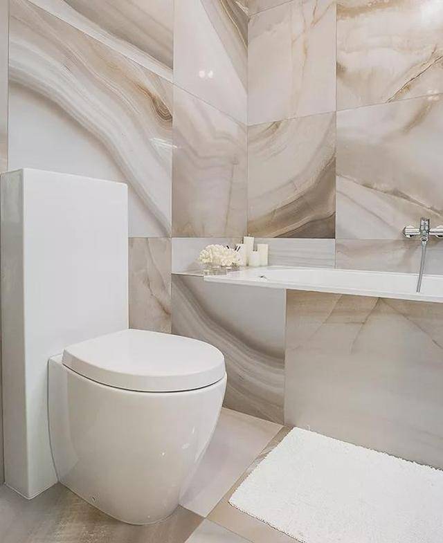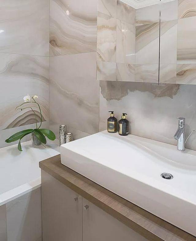 ▲洗漱间用了肉色纹理大理石在与白色洁具、木色台面的搭配下显得很干净、舒适又有点温柔的感觉。