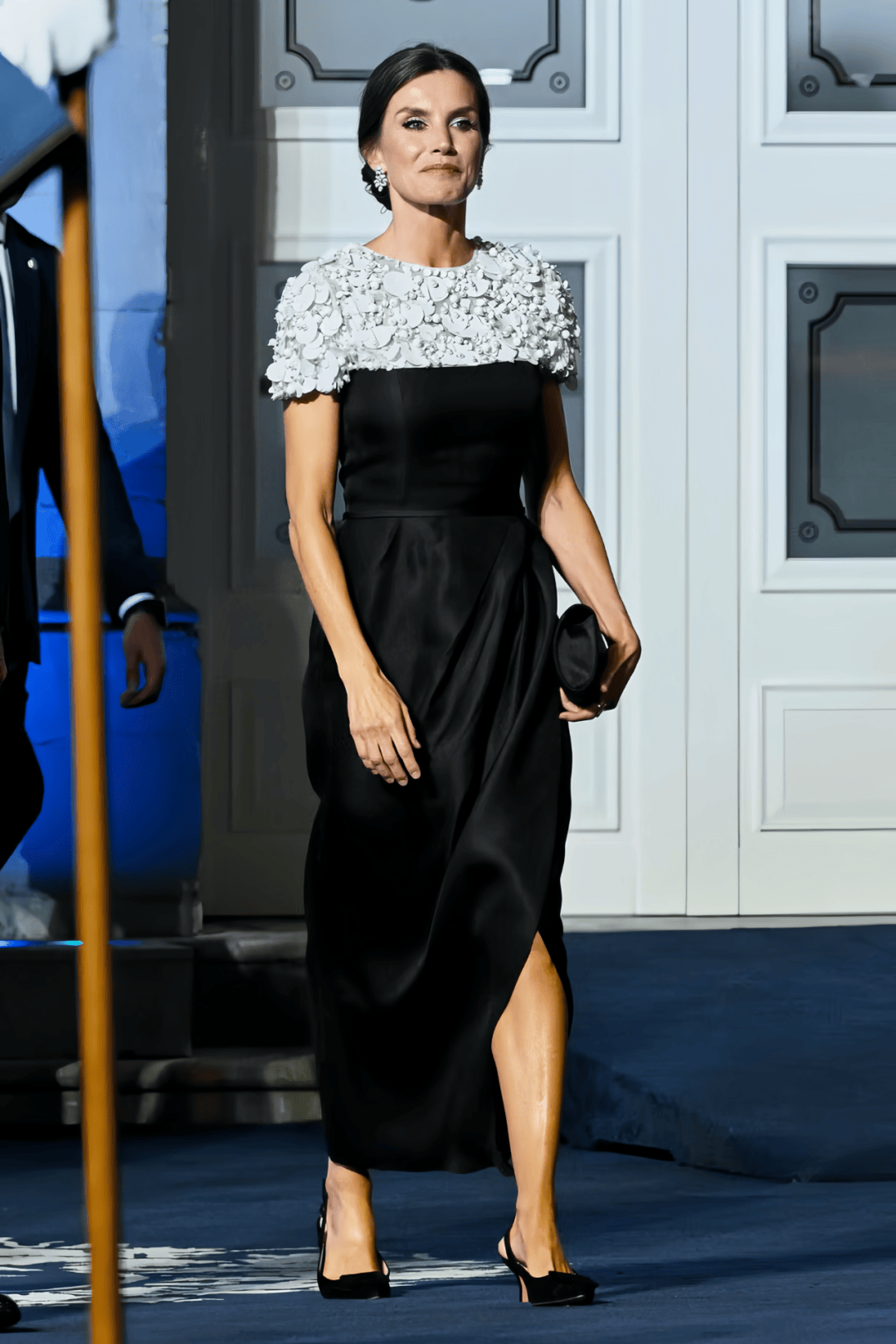 一下飞机,莱蒂齐亚挽着国王的手,以 All Black 造型亮相,干练又利落。她选择了 COS 的黑色大衣、Massimo Dutti 乐福鞋、Carolina Herrera 手袋,全黑被她穿得低调又不失风度。▼
