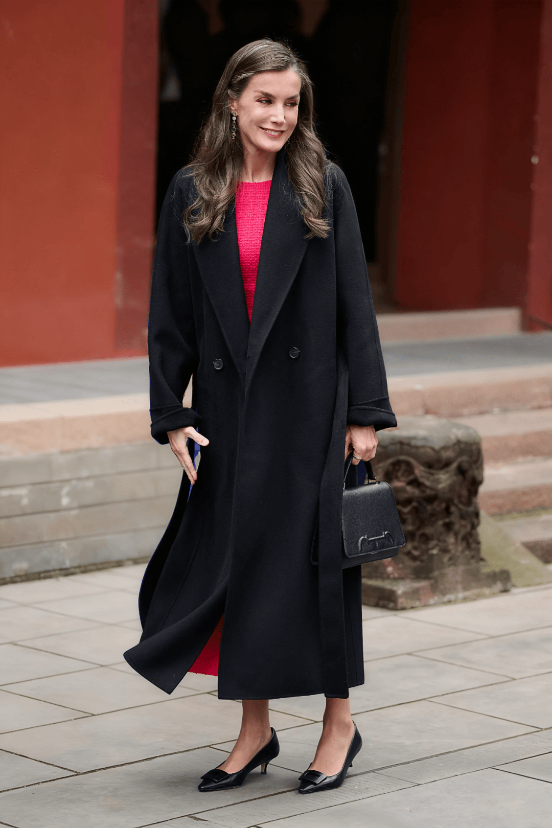 黑色大衣很适合重复穿搭,另一套造型,莱后把内搭换成饱和度更高的玫红色,脚下也换成了 MAGRIT 高跟尖头鞋,更加提气有精神。▼