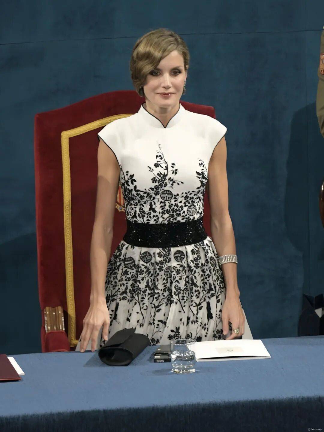 2017 年 10 月,出席阿斯图里亚斯公主颁奖典礼,她一袭黑白旗袍领连衣裙,花朵缀饰+黑色串珠宽腰带,搭配卡地亚钻石手镯,美得像 50 年代的电影女主。不仅优雅,还很有文化底蕴。▼