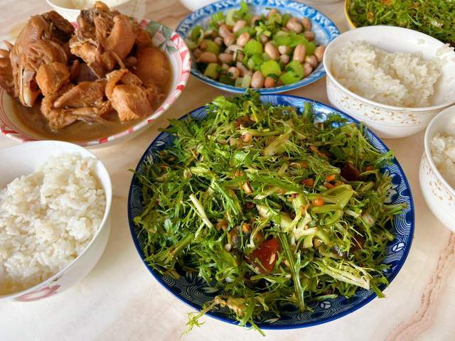 有了这些,中午的菜就不用愁了,炖个鸡,再做两个凉拌菜,一家五口就够吃了。这自家养的土鸡啊,就是不一样,炖出来满屋飘香,那味道,绝了。