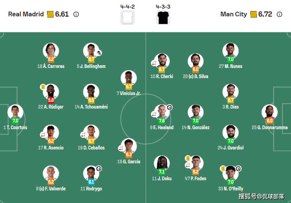 - 全场最低分:皇马后卫吕迪格仅获5.8分。他在禁区内对哈兰德的抱摔送点成为比赛转折点,且全场防守表现低迷,是全场唯一一位评分低于6分的球员。