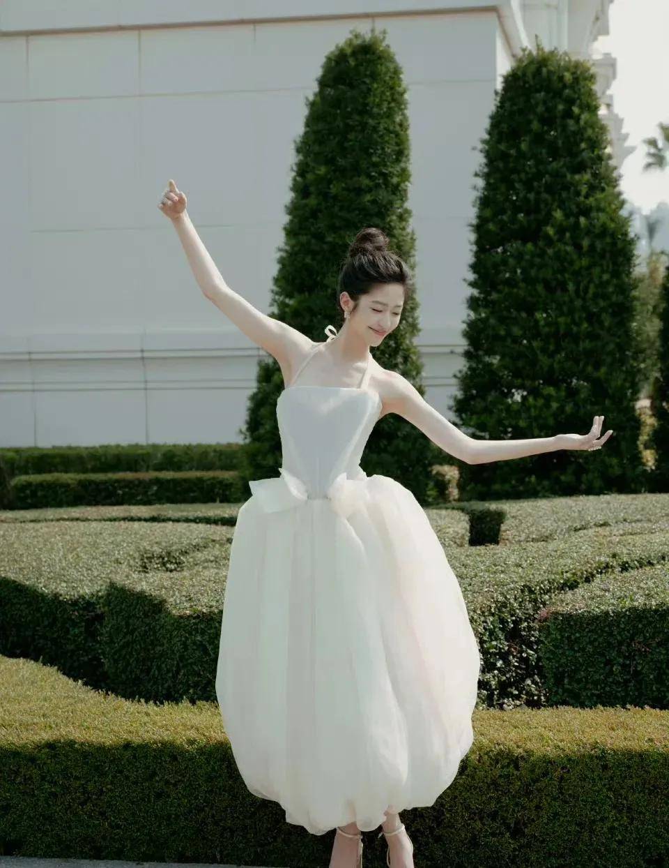 赵今麦以蝴蝶结装饰的高盘发优雅现身,突显了漂亮的肩颈线条,这次她上身了Aadnevik 2026春夏系列长裙和Stuart Weitzman高跟鞋,黑色刺绣腰封点缀的纯白纱裙浪漫优雅,搭配Pomellato Sabbia系列耳环、戒指,以及Iconica系列手镯,高贵造型宛若天鹅公主。