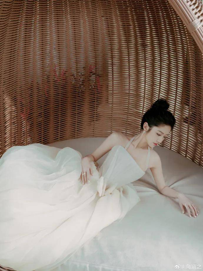 - 向涵之:向涵之的造型让人惊艳,来自DAS LA VIE的白色长裙,裙摆蓬松向下收紧成花苞,上身又采用了紧身吊带的设计,让人想到芭蕾舞裙,去掉了略显累赘的头纱使得造型更轻盈,TASAKI Balance系列的戒指与耳环作为小点缀,以少胜多。