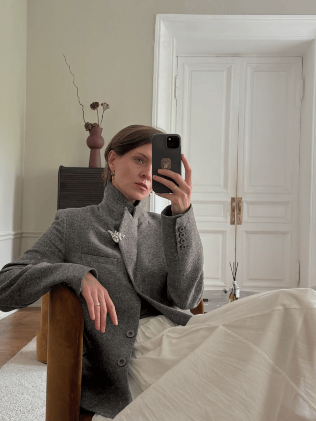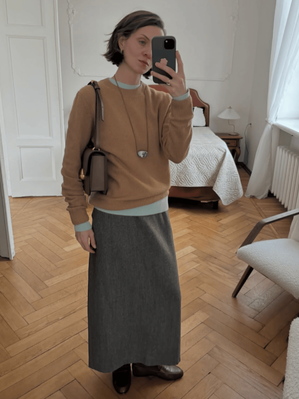 构成她冬日衣橱基调的是人人可以找到的单品:一件剪裁合身的西装外套、一条版型优秀的半裙、一件软糯的雾蓝色针织衫......