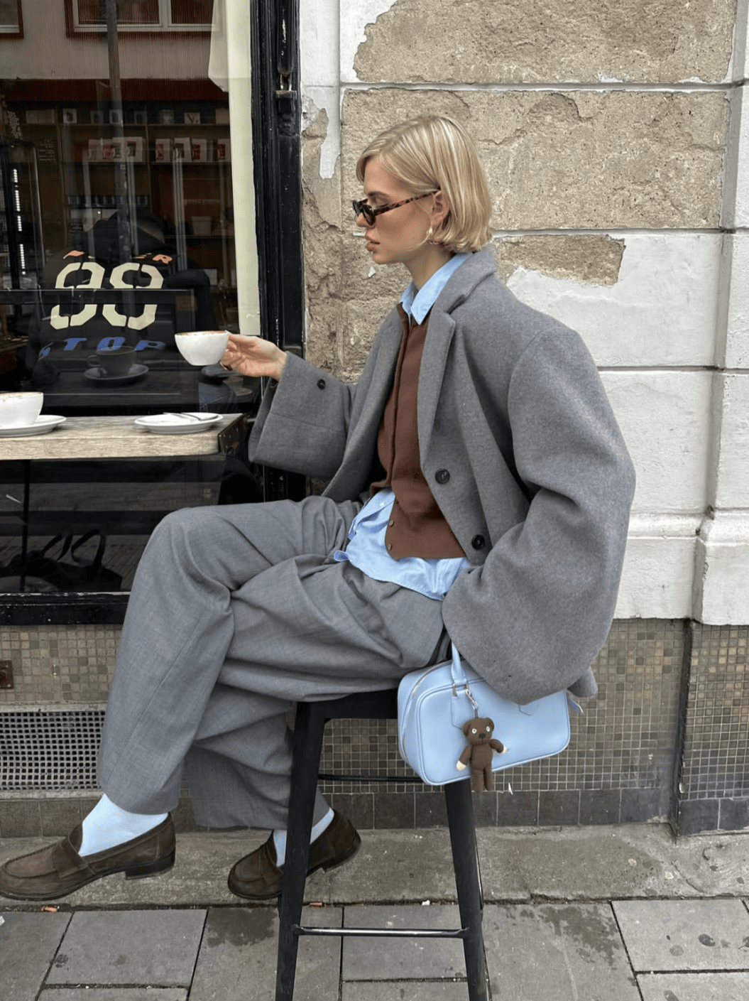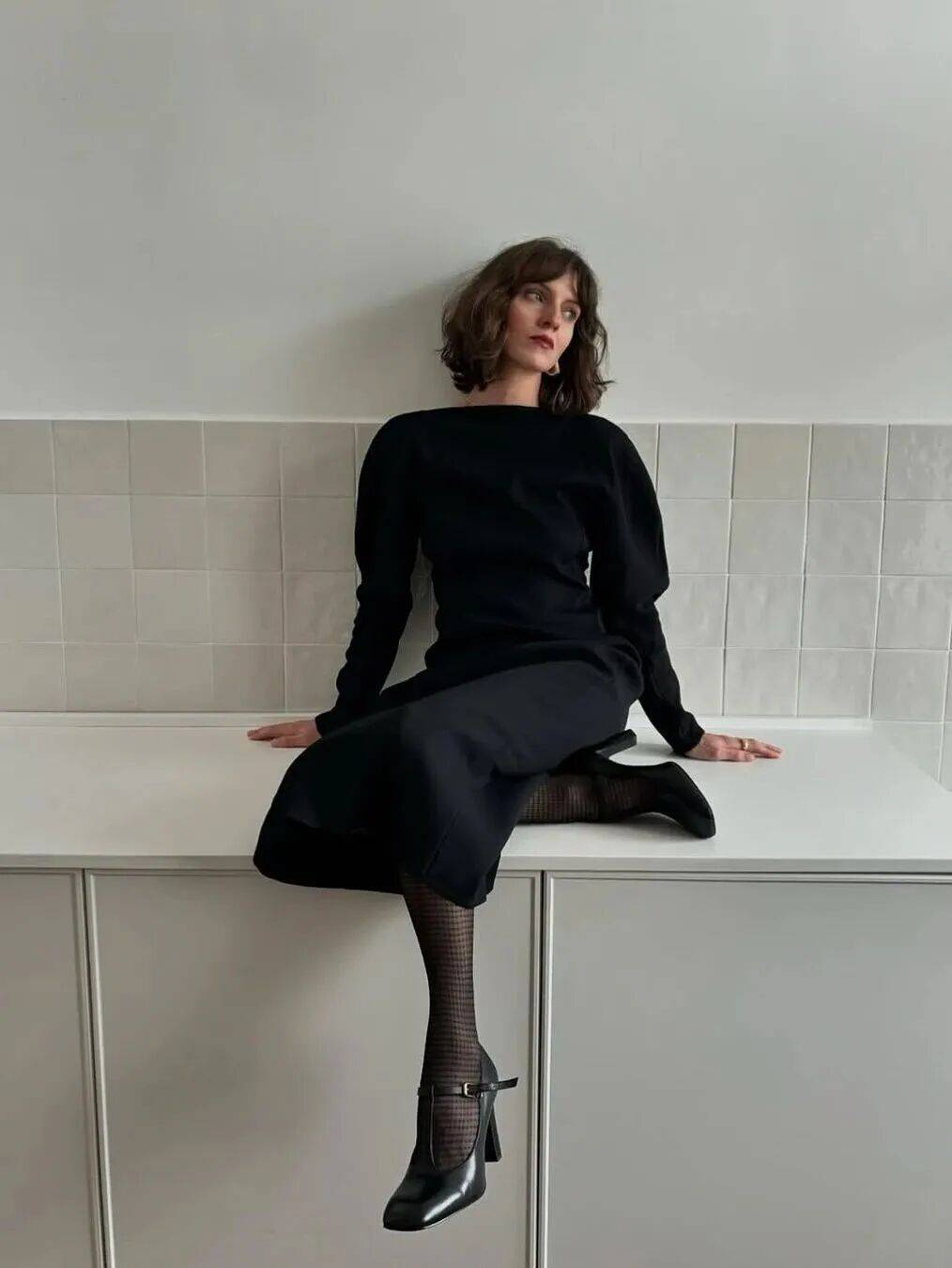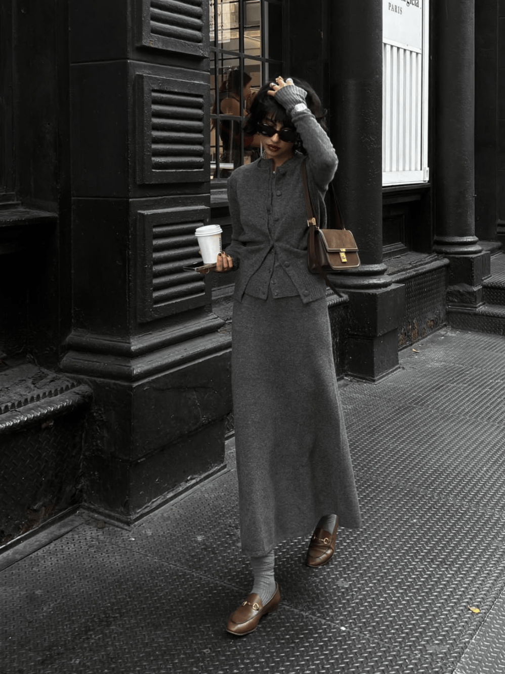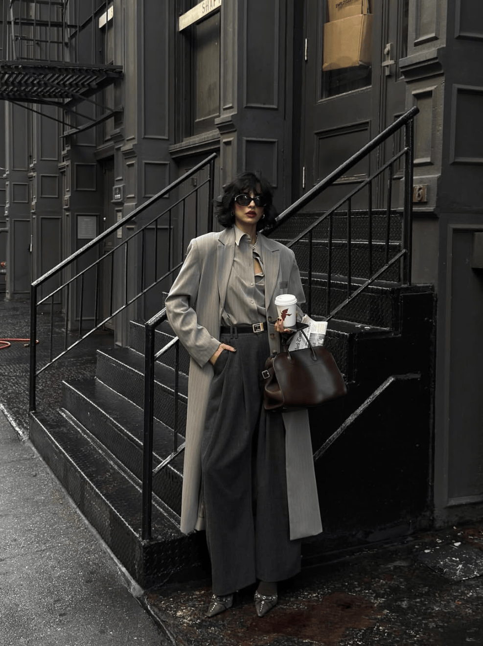 一件剪裁完美的廓形大衣,她不会简单地搭配毛衣长裤,而是内搭一套羊毛衫套装,再以一双质感细腻的黑色丝袜与乐福鞋收尾,在力量感中注入一抹危险的性感。