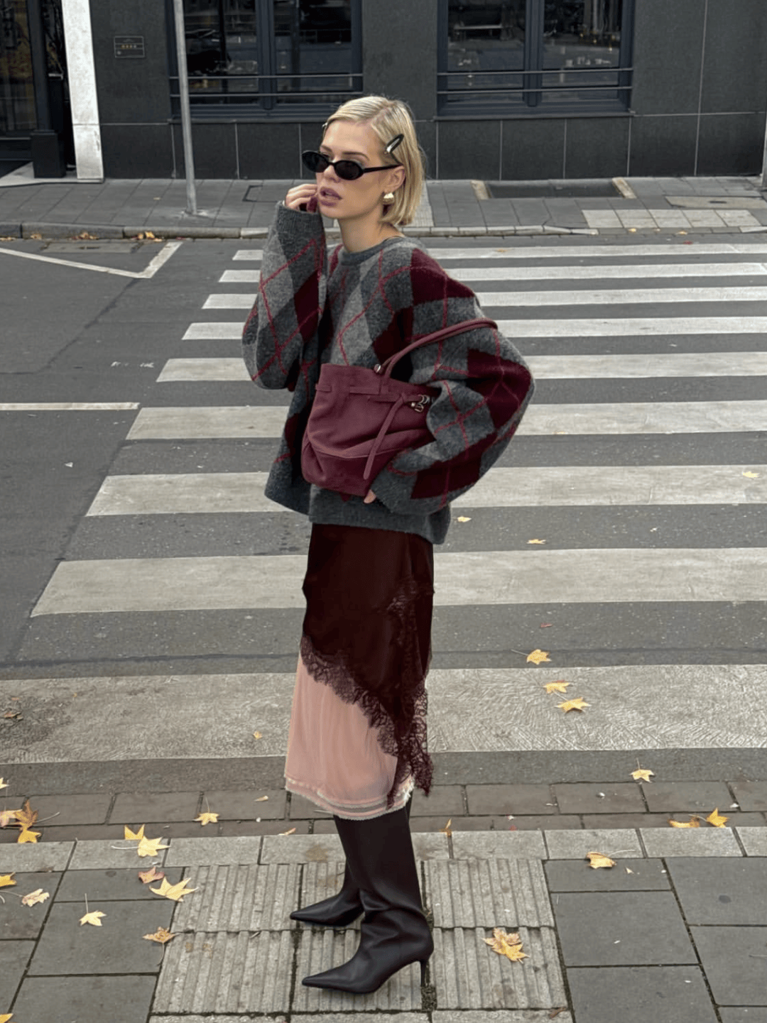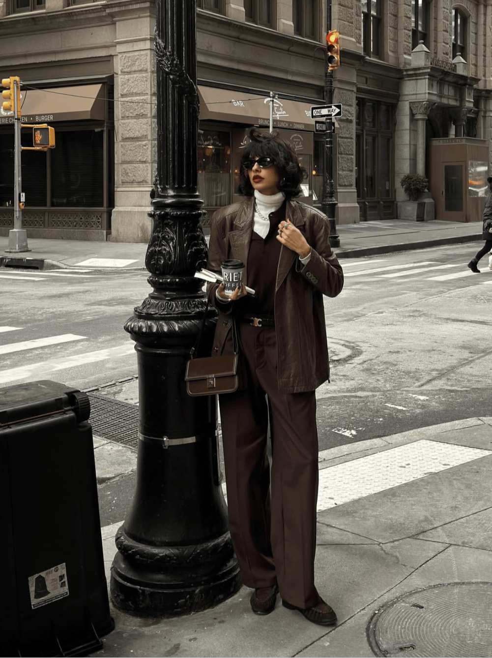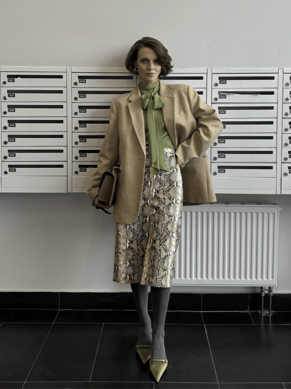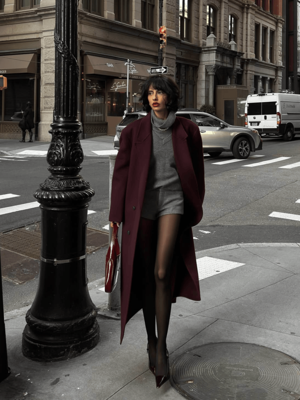 一件剪裁完美的廓形大衣,她不会简单地搭配毛衣长裤,而是内搭一套羊毛衫套装,再以一双质感细腻的黑色丝袜与乐福鞋收尾,在力量感中注入一抹危险的性感。