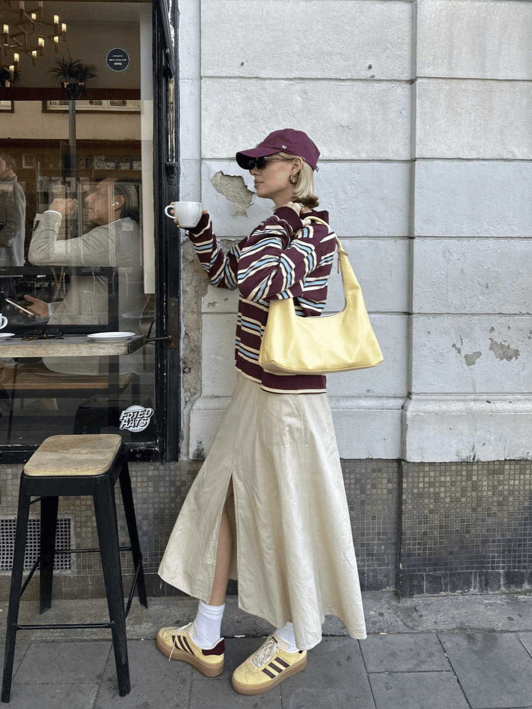 例如,一件芥末绿色的毛衣,她会用墨绿色的帽子包包让彩色的出现更自然;又或是用一双芥末绿的袜子在脚踝处巧妙呼应。
