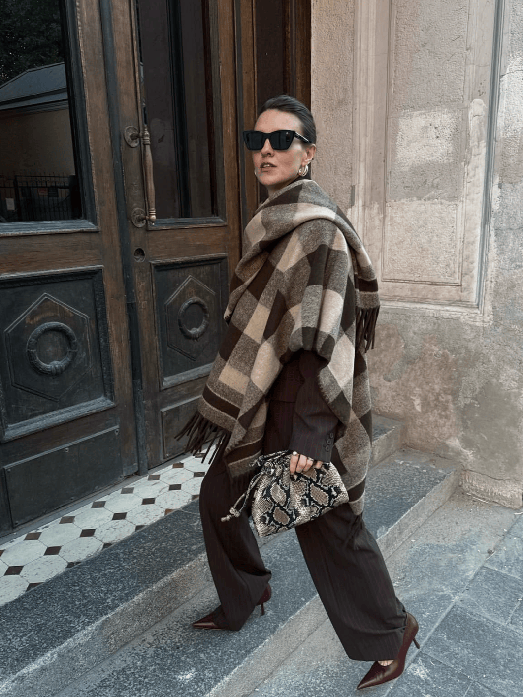 一身棕色的搭配,用同色系的柔软围巾围裹着上半身,增加流动又柔和的曲线美。