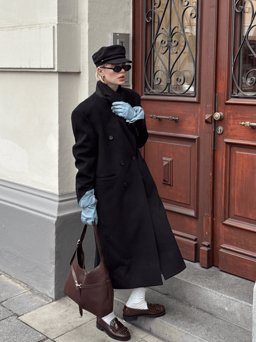 还有,如果大衣袖口的蓝色不够明显,就再用同色系的手套增加这抹蓝色的存在感。