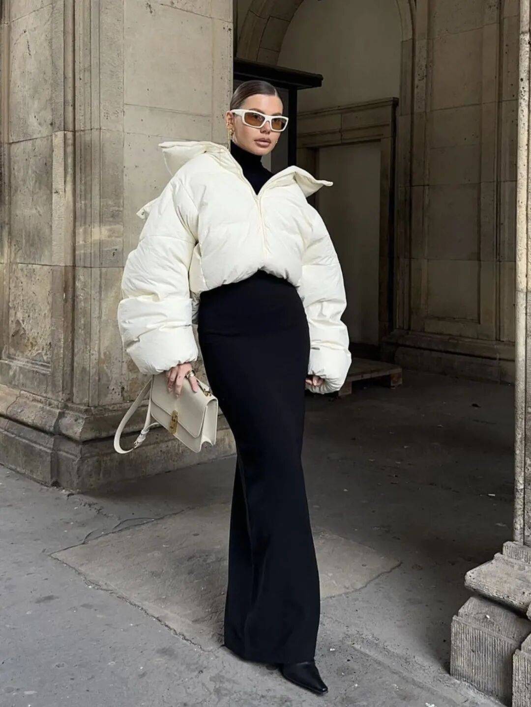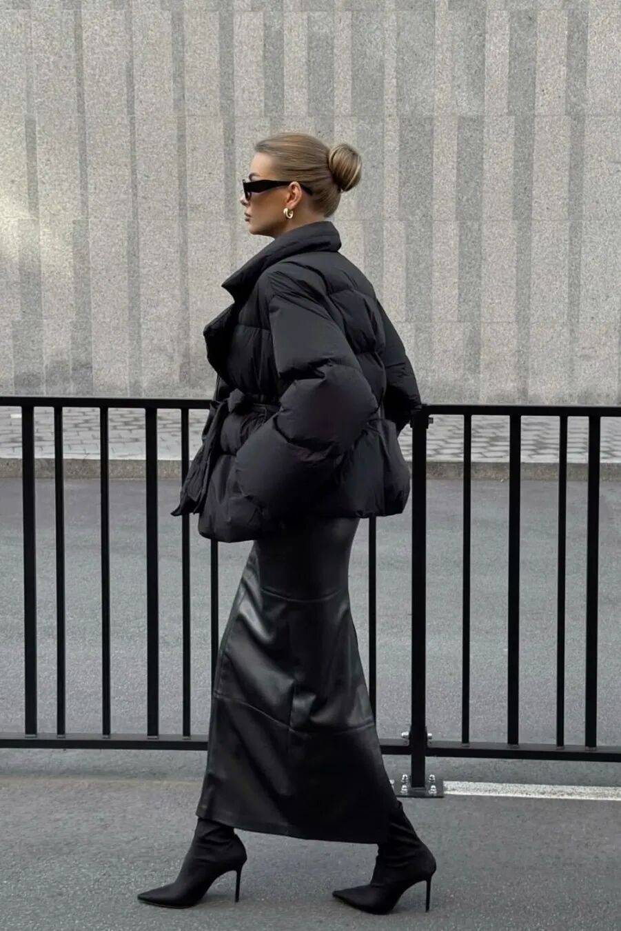无论是灵动的A字短裙、优雅的针织直筒裙,还是浪漫的百褶中长裙,在羽绒服的厚重对比下,裙装的轻盈与女性特质被奇妙地凸显。