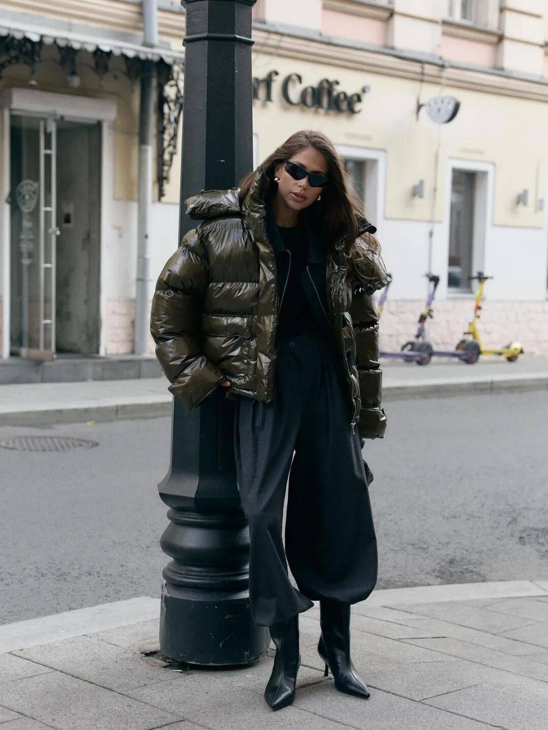 即使是全黑造型,也能通过亮面羽绒、哑光针织这样不同的光泽度对比,打破沉闷,凸显低调的酷感。