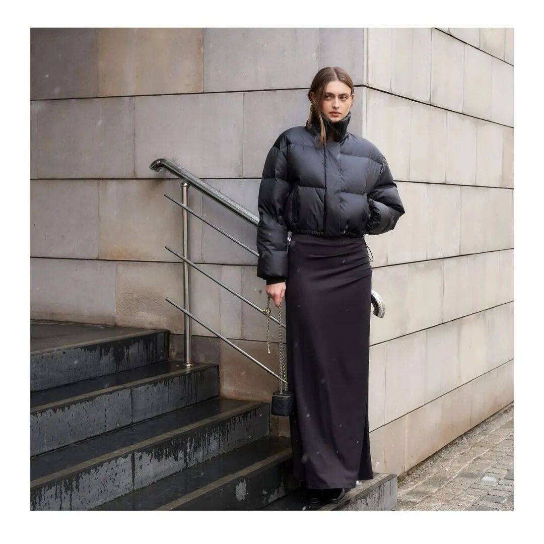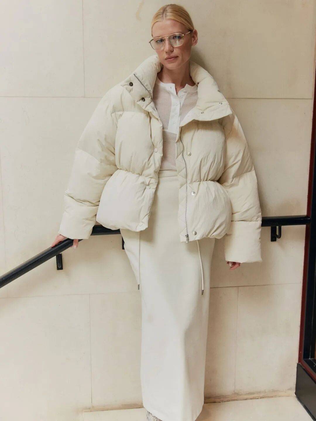 而与半身裙的邂逅,则让面包羽绒服展现出刚柔并济的别样浪漫。