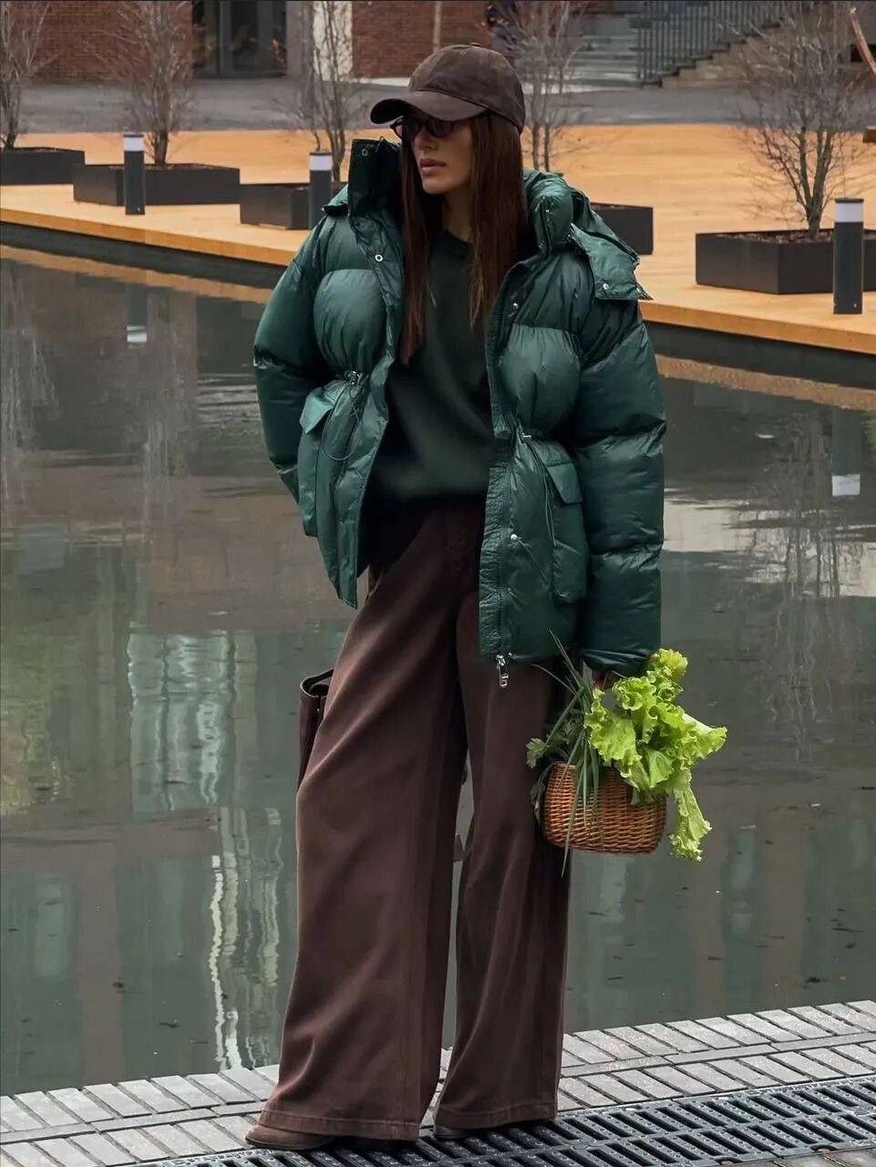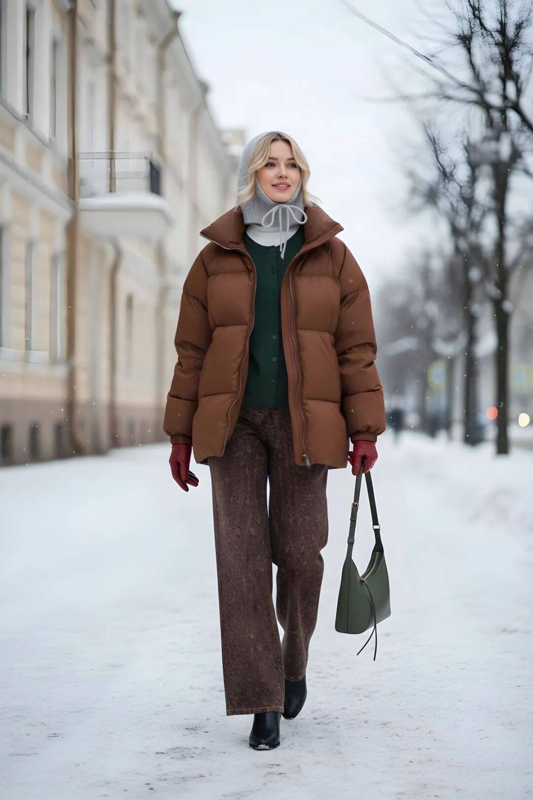 例如,一件绿色面包服,搭配棕色阔腿裤,如同森林与大地,沉稳中透出生机,是自然系配色。