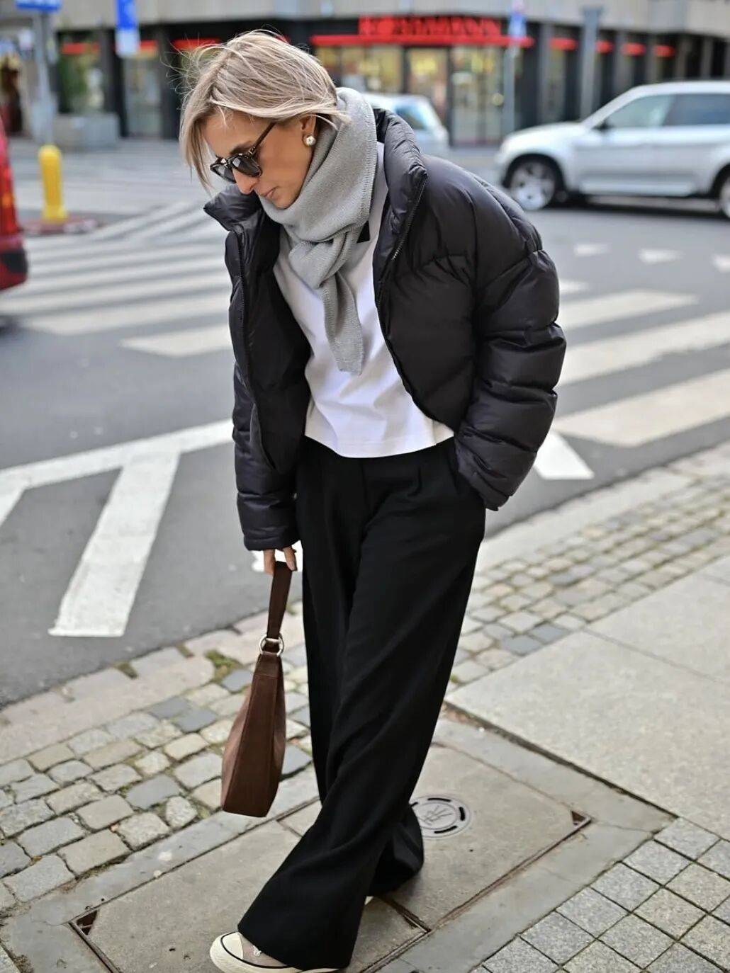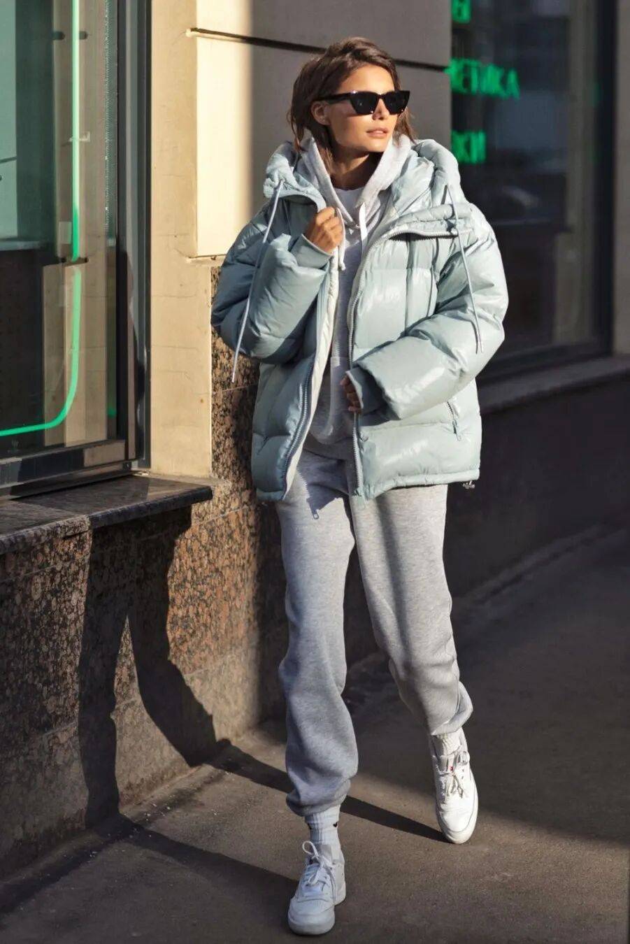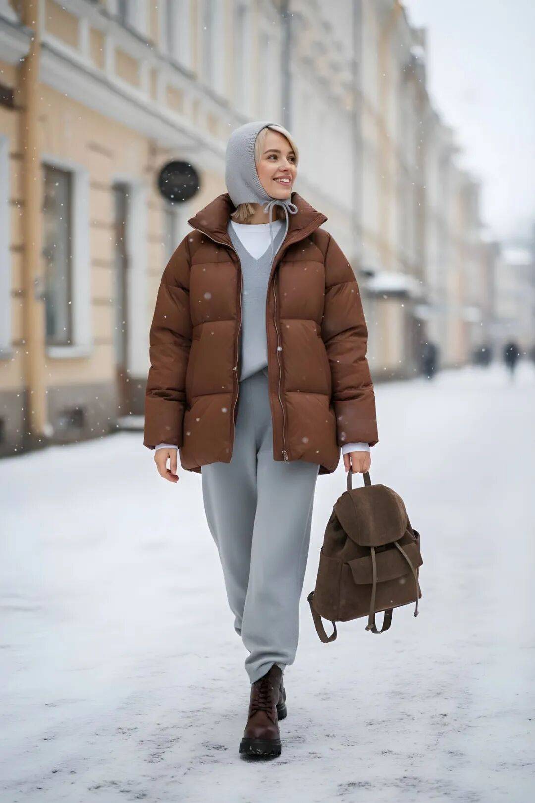 上身是蓬松柔软的保护罩,下身是极致贴合、展现腿部线条的运动Leggings,再配上一双厚底运动鞋或雪地靴。