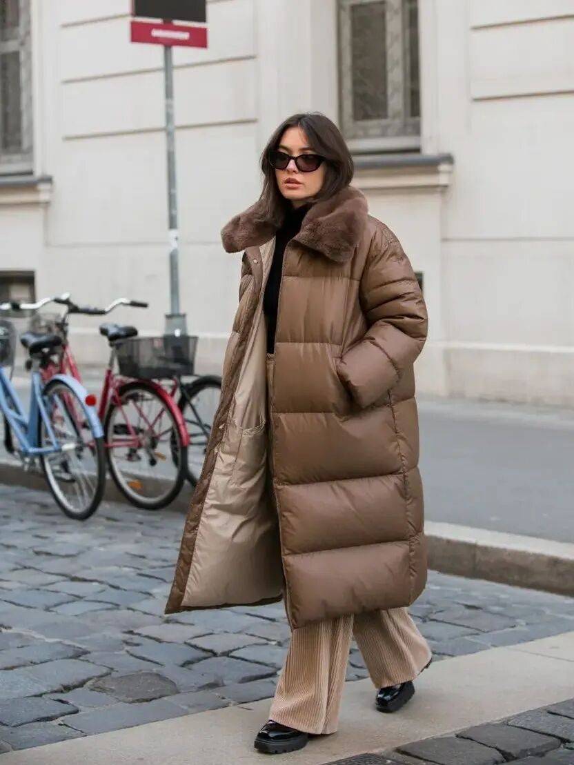 这种“上宽下窄”或“上重下轻”的视觉反差,打破了冬装固有的臃肿印象,让温暖与风情可以并存。
