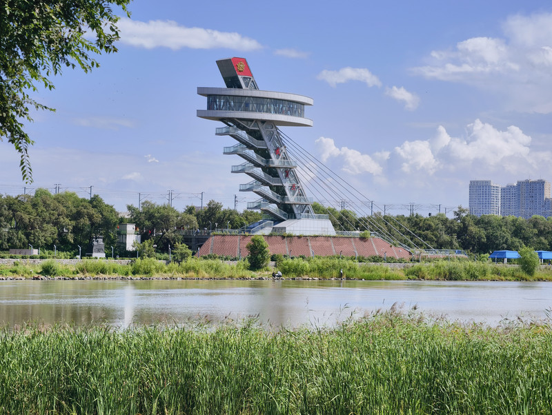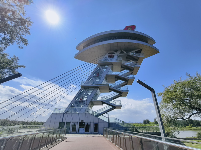 慢慢走进,原来这是哈尔滨铁道兵启航纪念塔,全高41米、呈60度角倾斜,整体造型犹如一艘扬帆启航的大船。