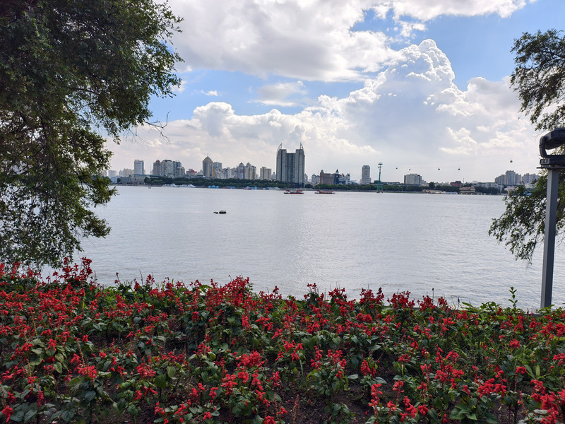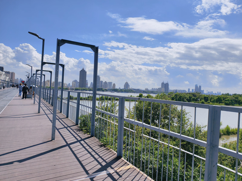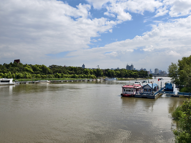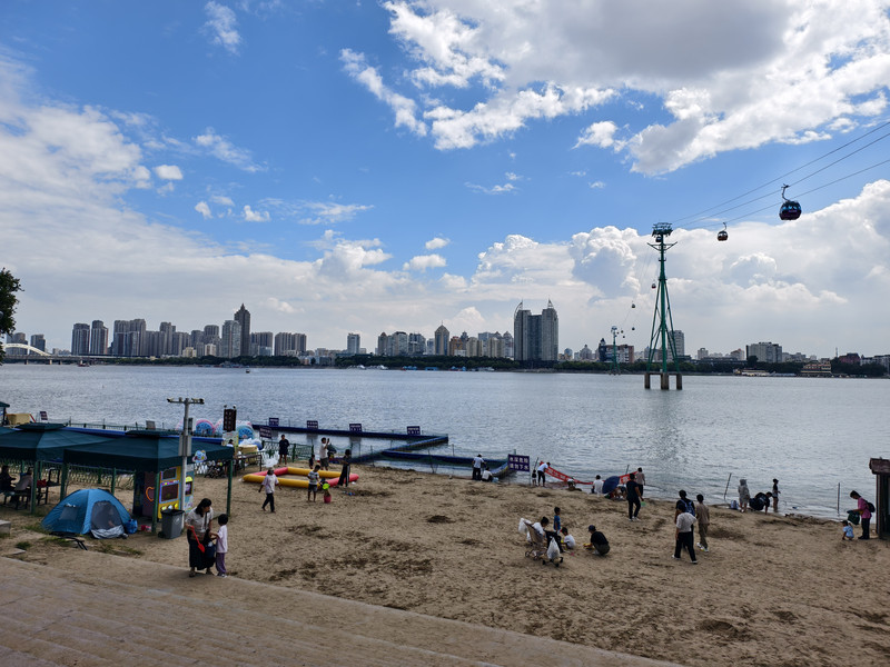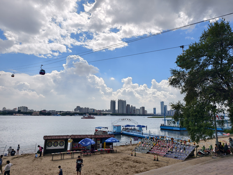 看到松花江了,头顶上就是松花江观光索道,南起通江广场,北至太阳岛风景区,横跨于松花江上,是颇具名气的观光交通工具。