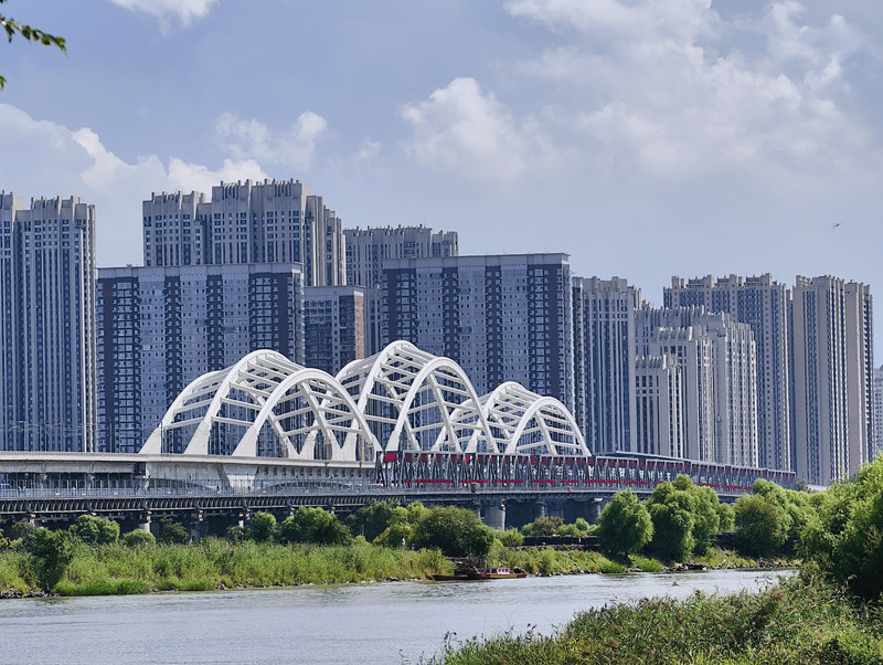 把镜头拉近,有白色钢架的就是新建松花江特大桥,是整体四线刚性系杆拱桥,主桥上部结构采用混凝土连续梁与钢管混凝土柔性拱组合。