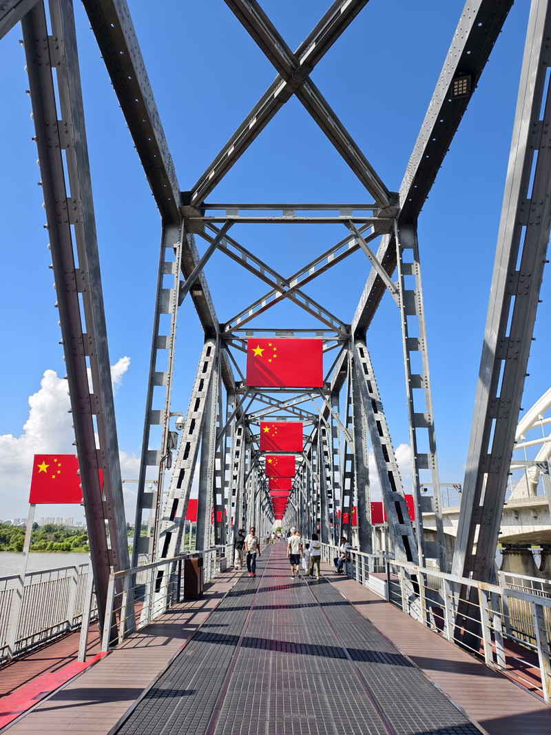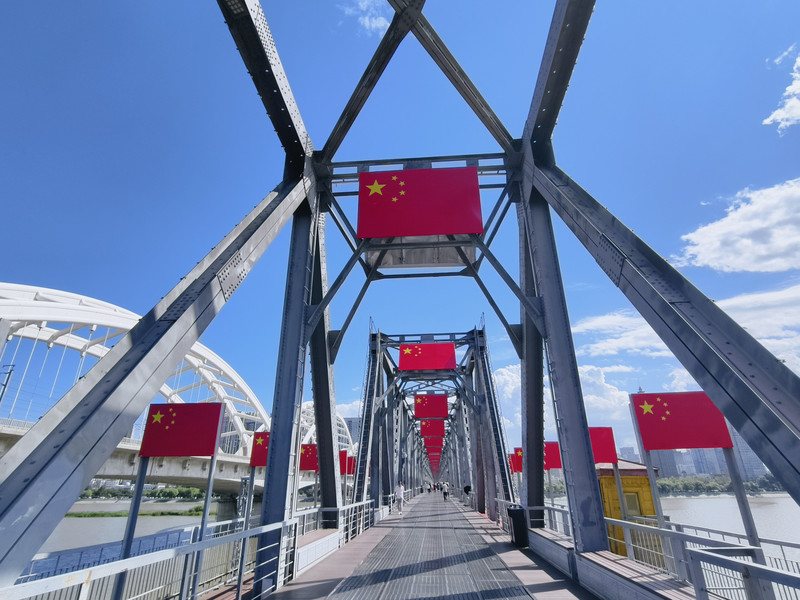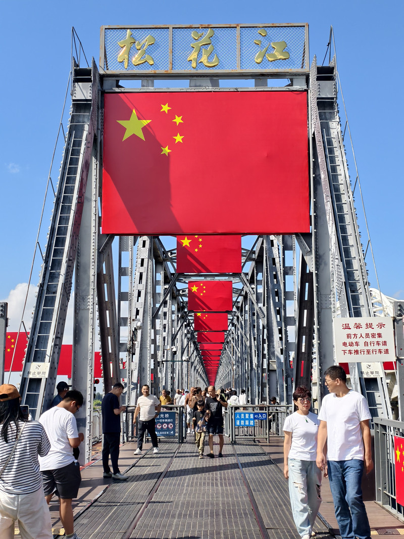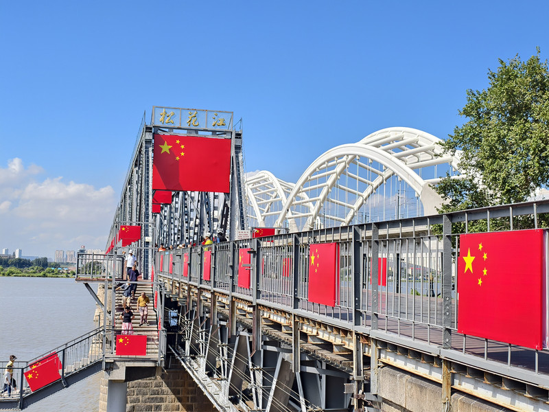 边上挂满国旗的铁桥就是已经退役的,大名鼎鼎的松花江铁路大桥。