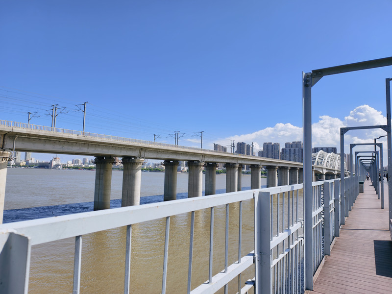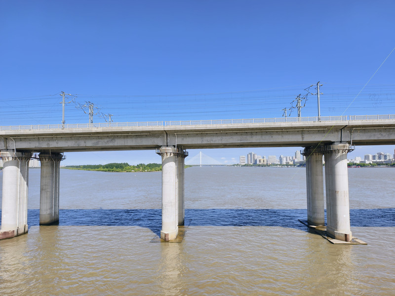 趴在松花江铁路大桥的栏杆上,近距离观看新建松花江特大桥。