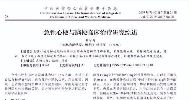 [1]急性心梗与脑梗临床治疗研究综述,张洁英,中西医结合心血管病电子杂志,2019-07-24
