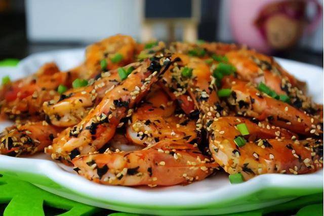 虾裹薄淀粉(炸后酥脆),复炸一次(更脆),海苔+芝麻最后小火炒香(避免糊);