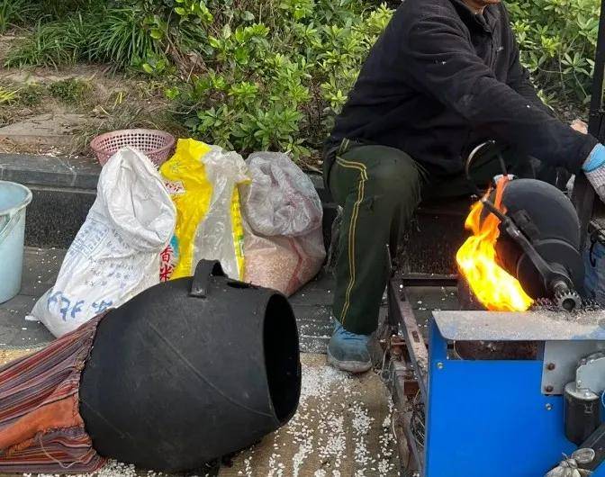 放入玉米粒之外,要拿着滚筒机器的把手顺着一个方向摇,然后往下一压,机器就会发出“嘭”的巨大声响。那争先恐后的爆米花就顺着机器口跑进麻袋中去了。