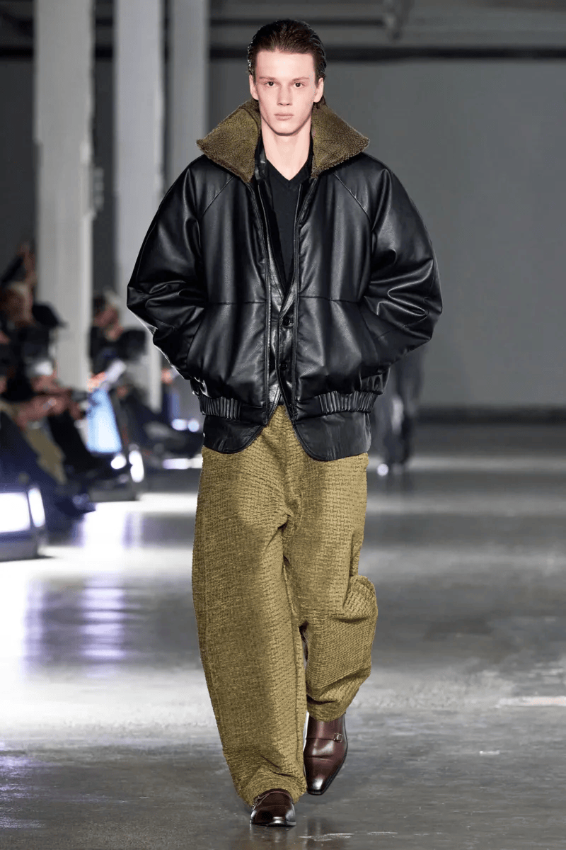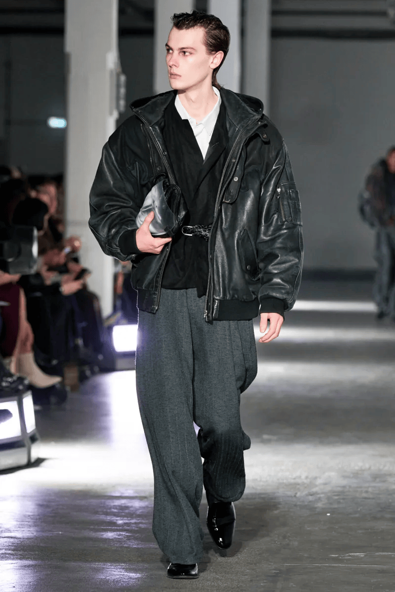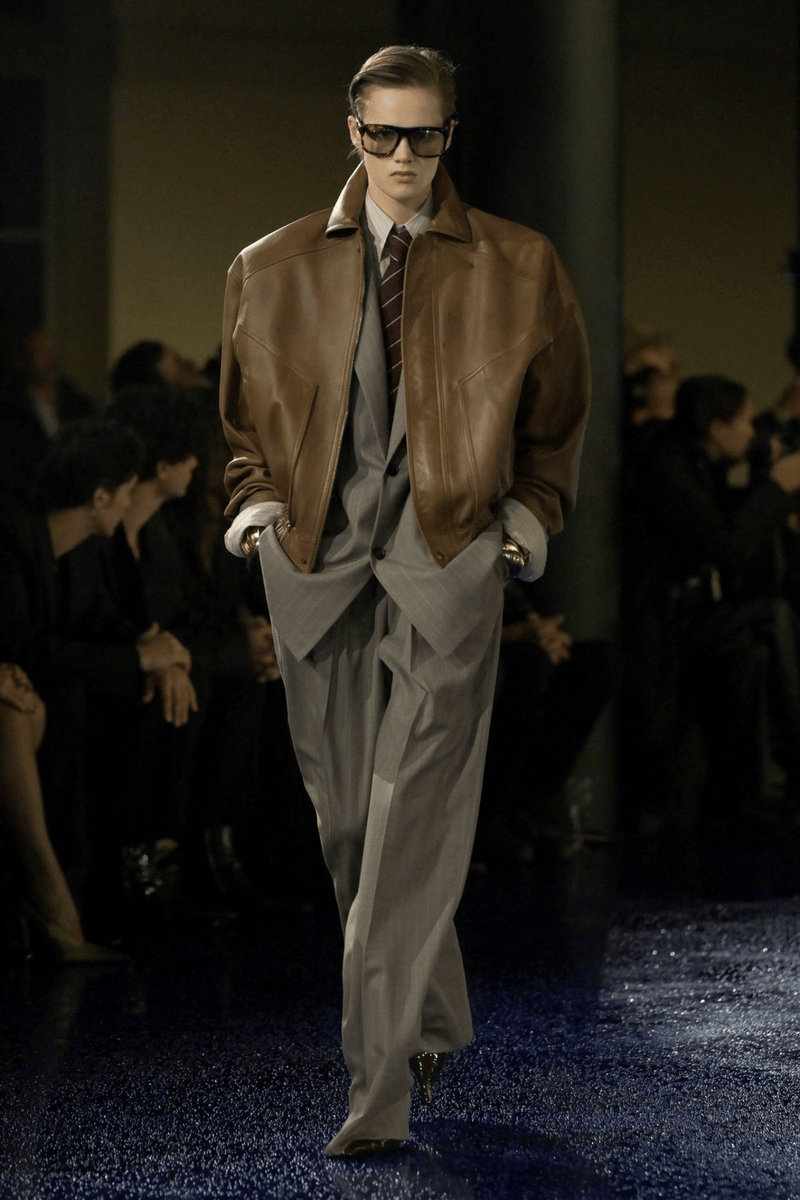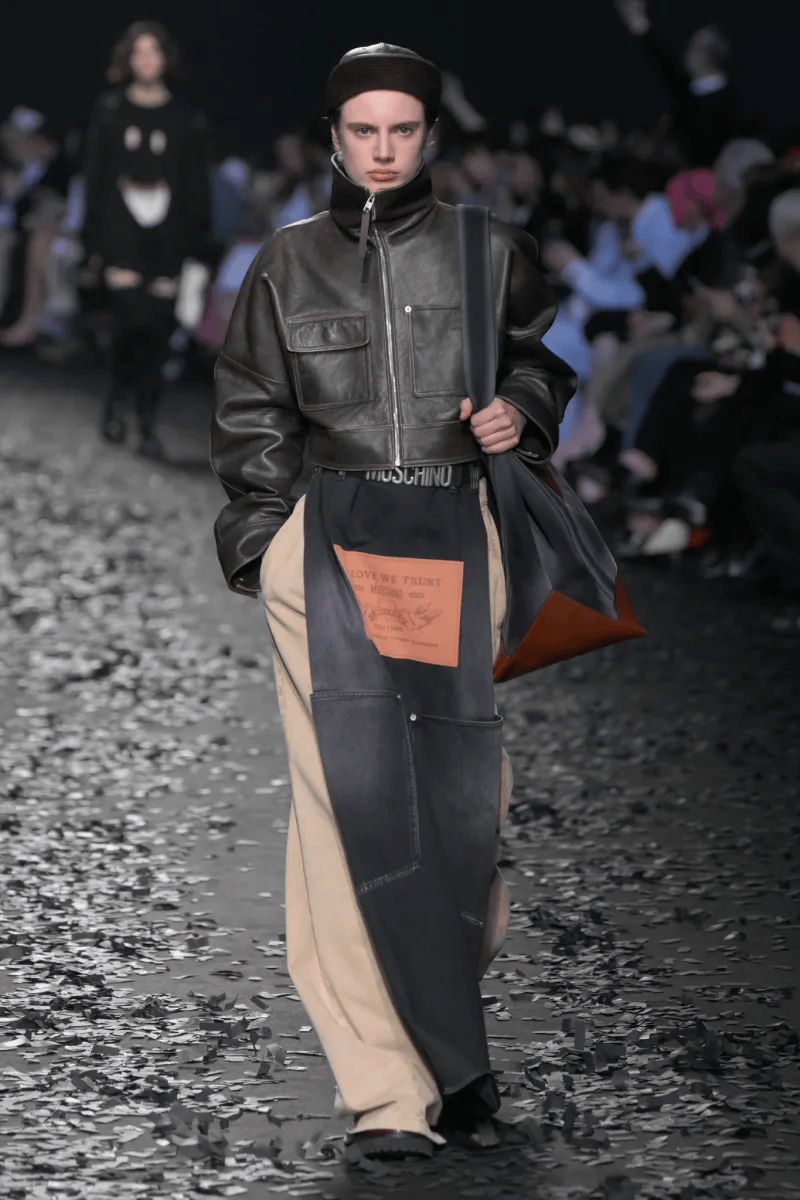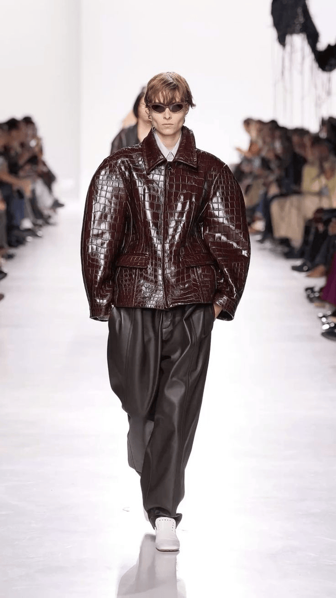 符号重构:经典翻领、双排扣等学院元素被注入 oversized 轮廓、荧光镶边或泼墨印花,将秩序感转化为个性化宣言,如同“绅士外套染上摇滚血液”。