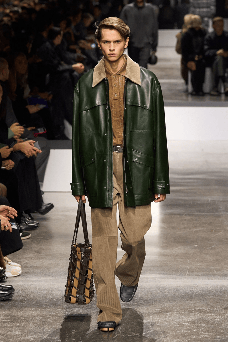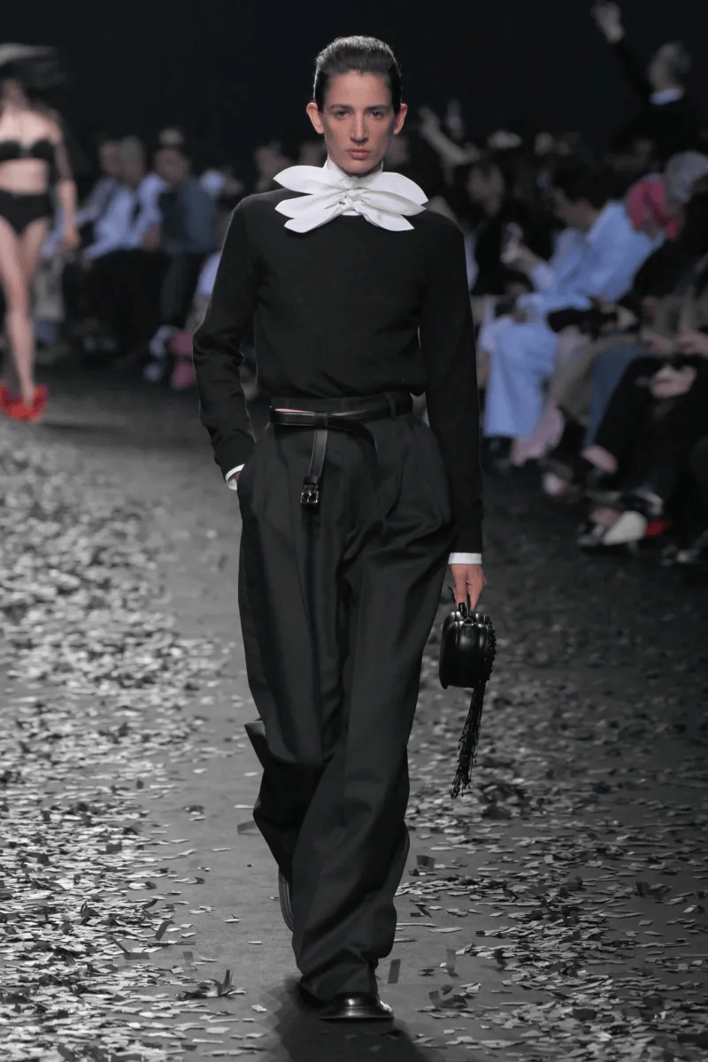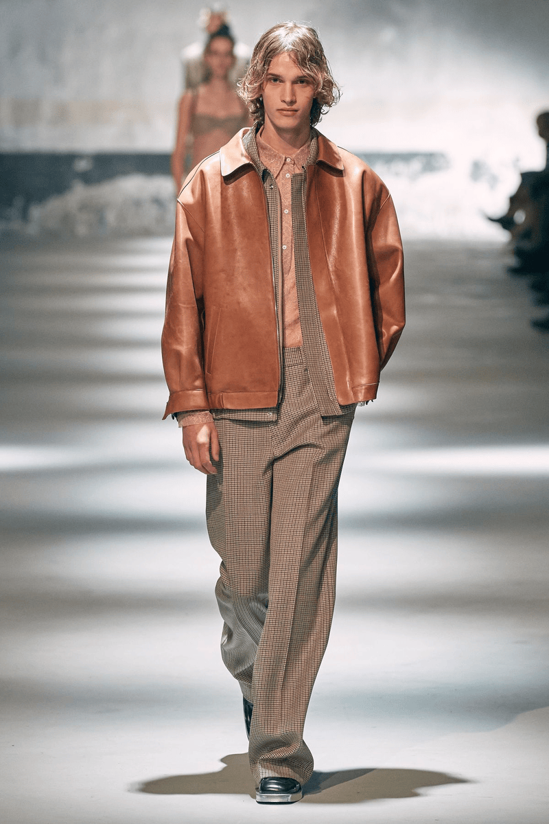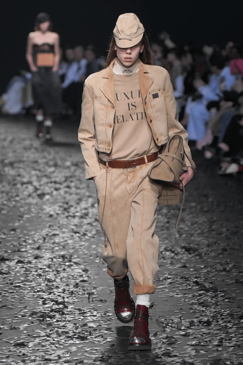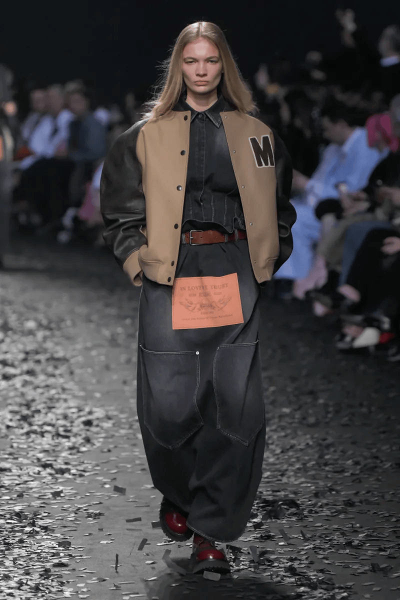 符号重构:经典翻领、双排扣等学院元素被注入 oversized 轮廓、荧光镶边或泼墨印花,将秩序感转化为个性化宣言,如同“绅士外套染上摇滚血液”。