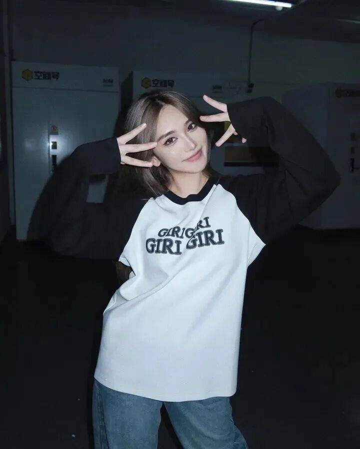 - 飒系造型:黑色短款皮衣配工装裤、oversize白衬衫内搭抹胸配破洞牛仔裤,酷感十足,气场拉满,与甜系造型判若两人。