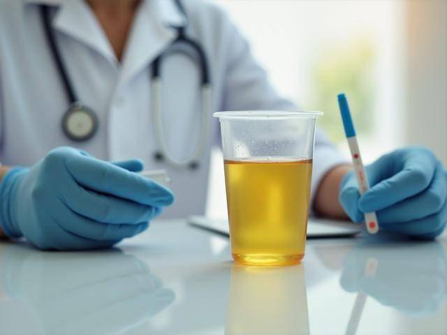 🖼️ 图片2:穿白大褂戴手套者手持检测棒,面前有黄色尿液样本