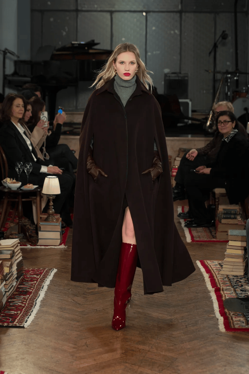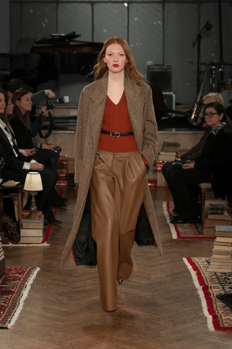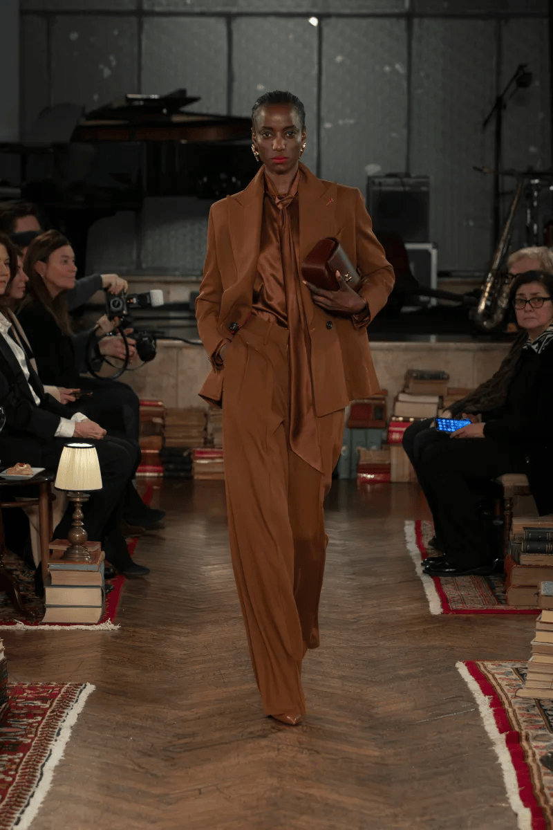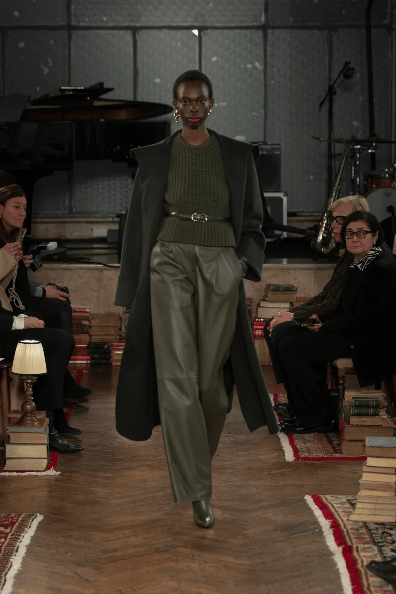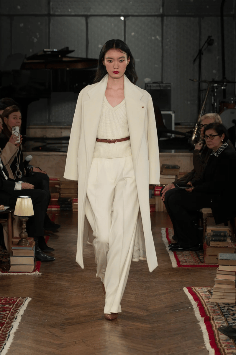 光泽感点缀:缎面半裙、丝绒裤装、金属感配饰(非大面积)的加入,在哑光基调中增添华丽层次与节日氛围。