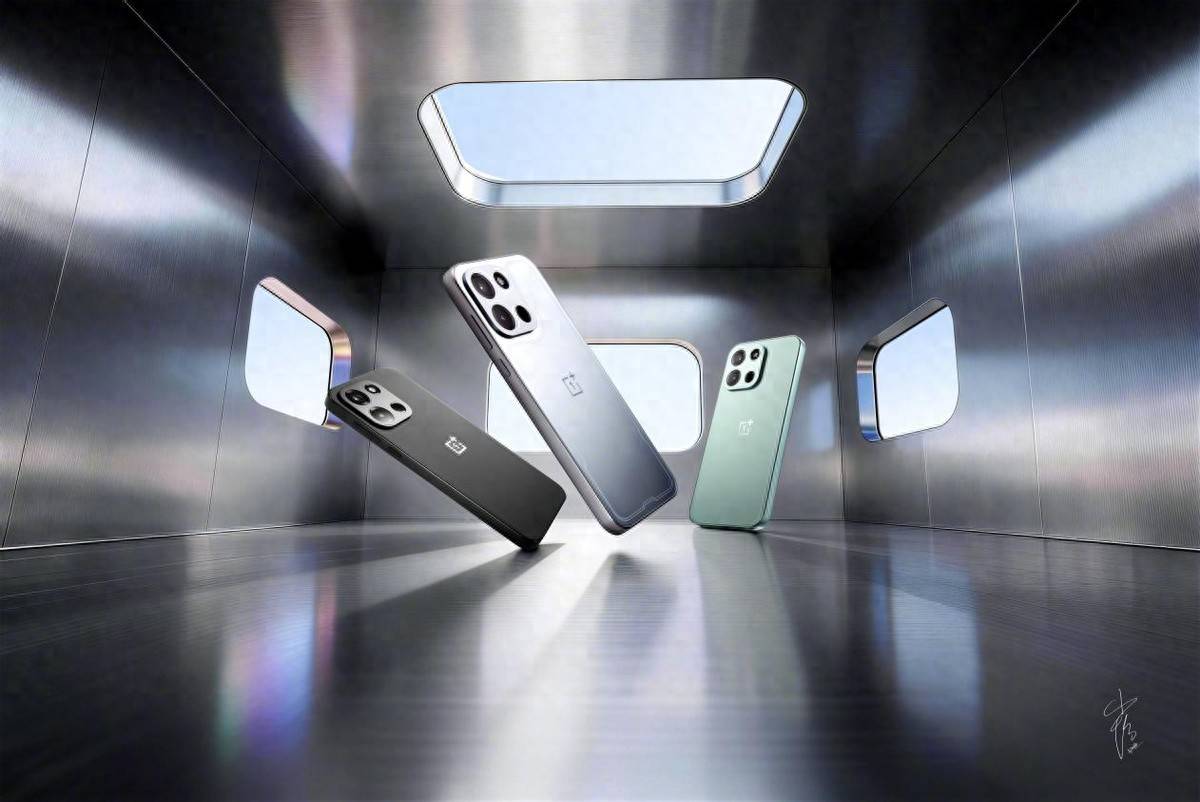 图片1:展示三部悬浮状态的一加手机,分别为黑、银、青三色