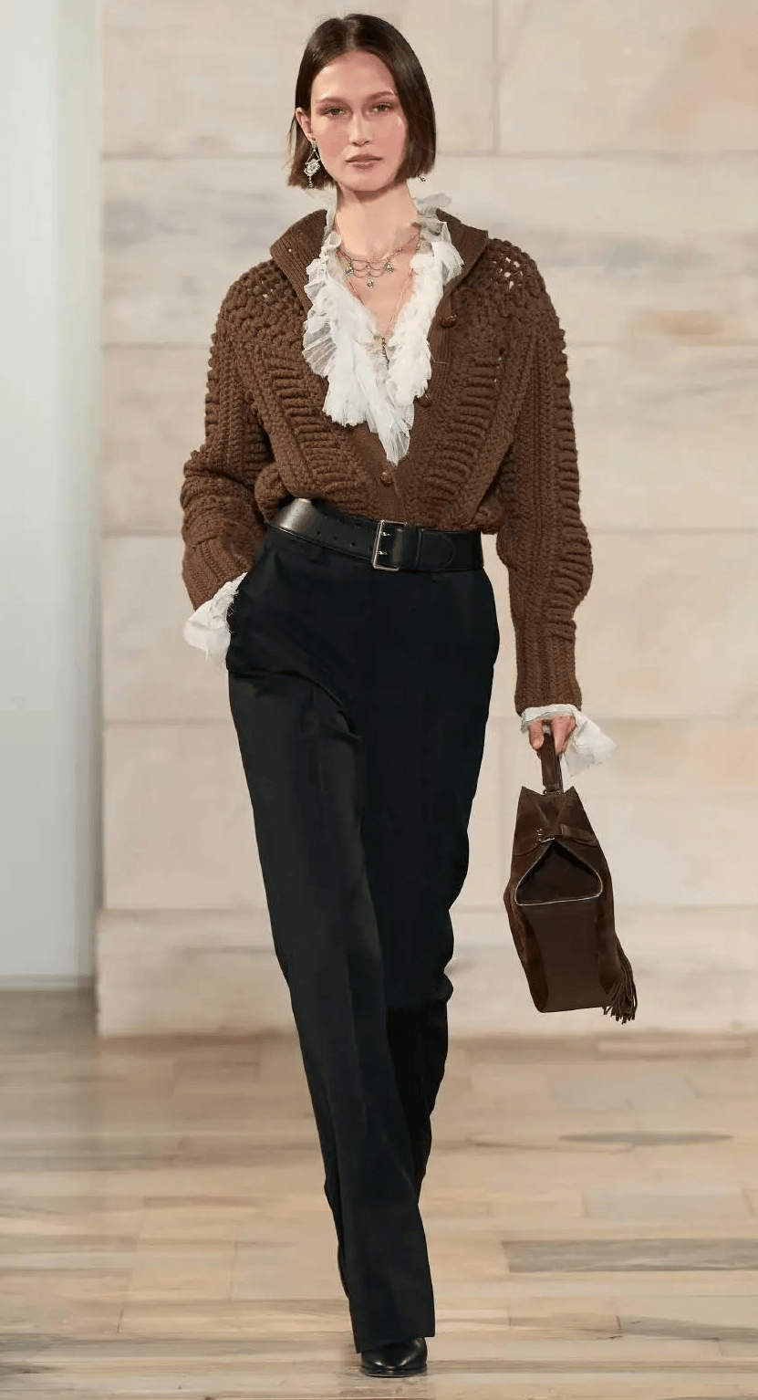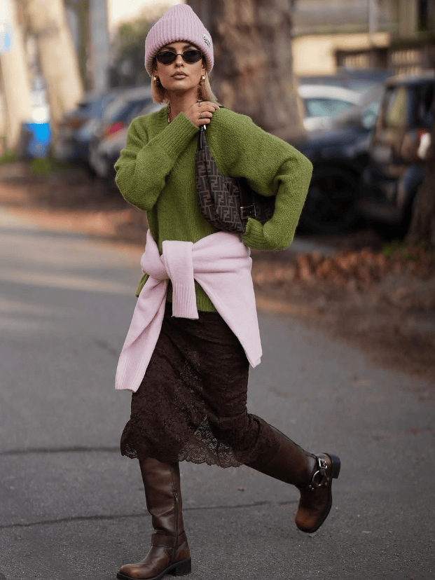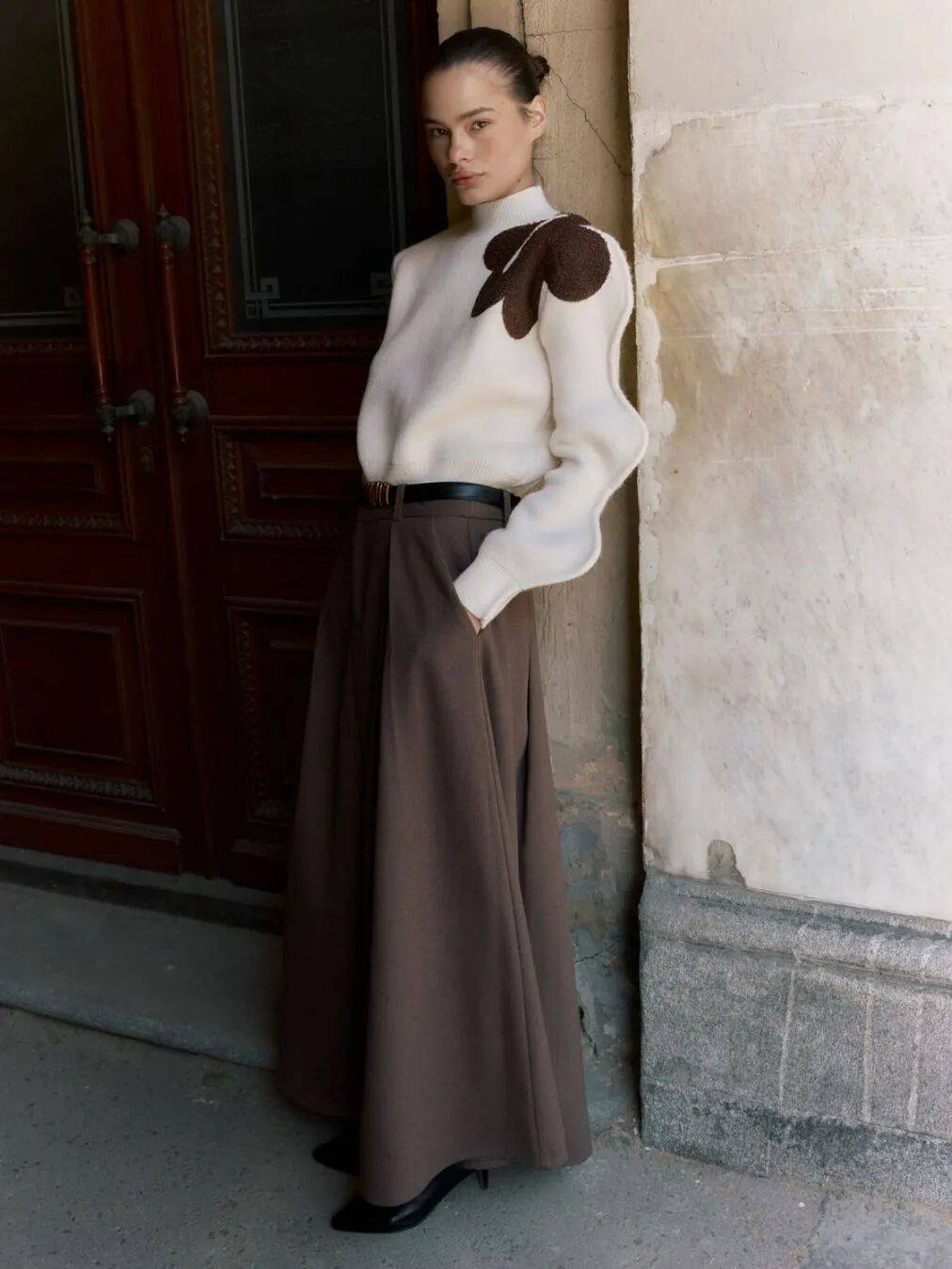 墨绿/橄榄绿毛衣 + 深棕灯芯绒阔腿裤