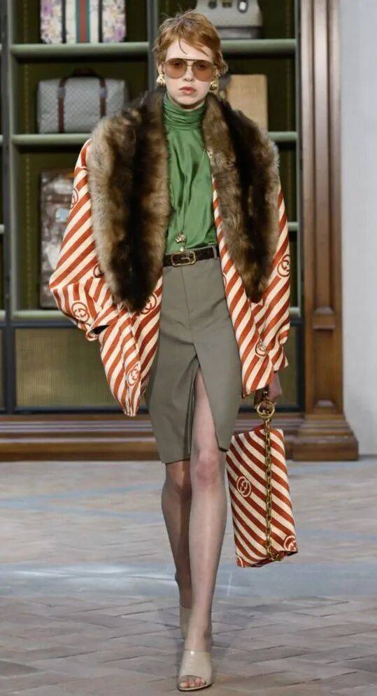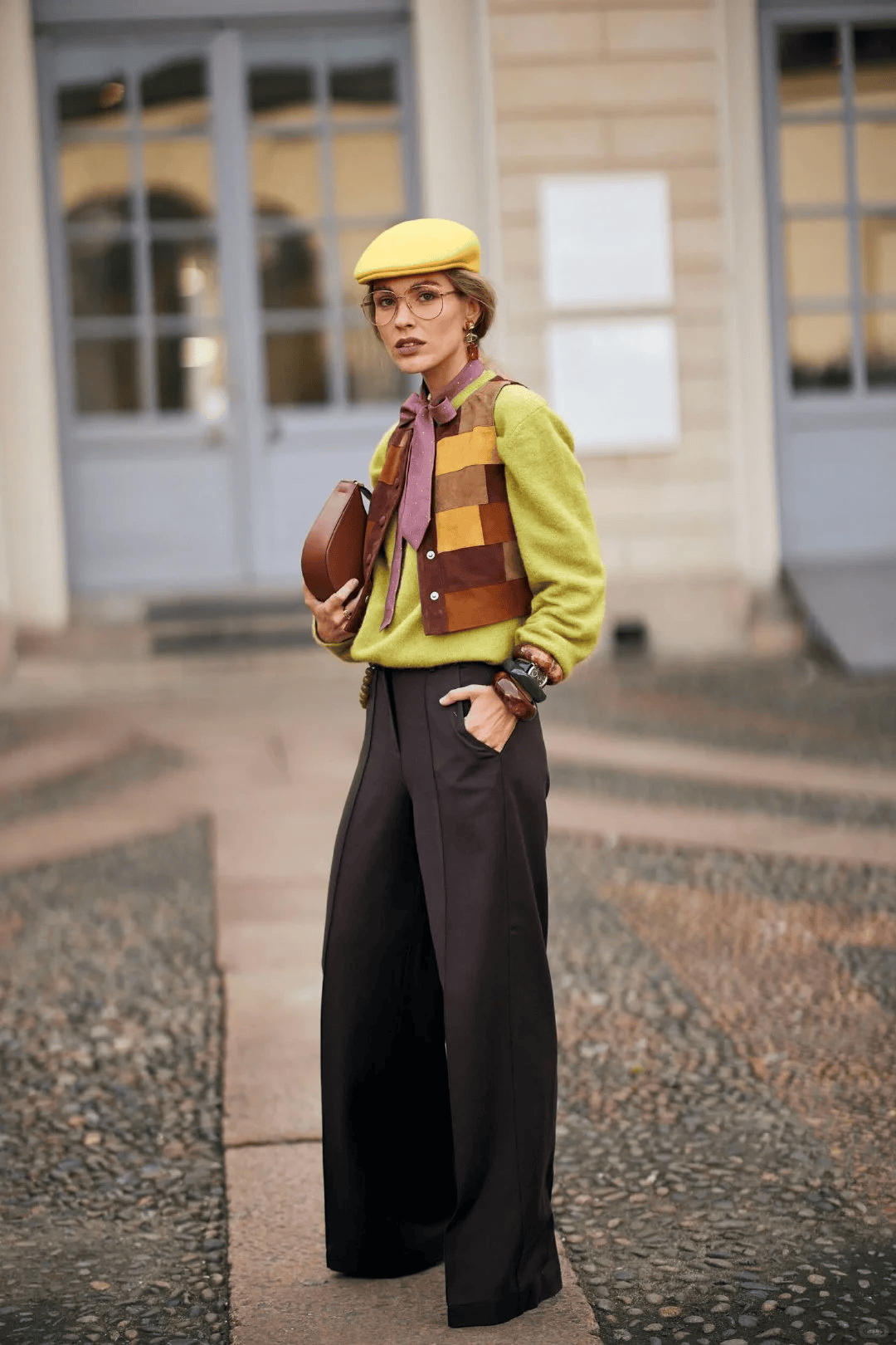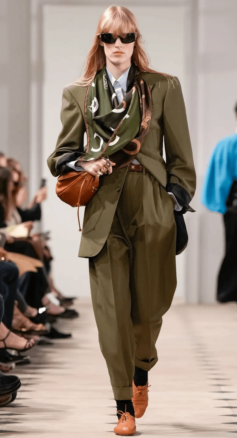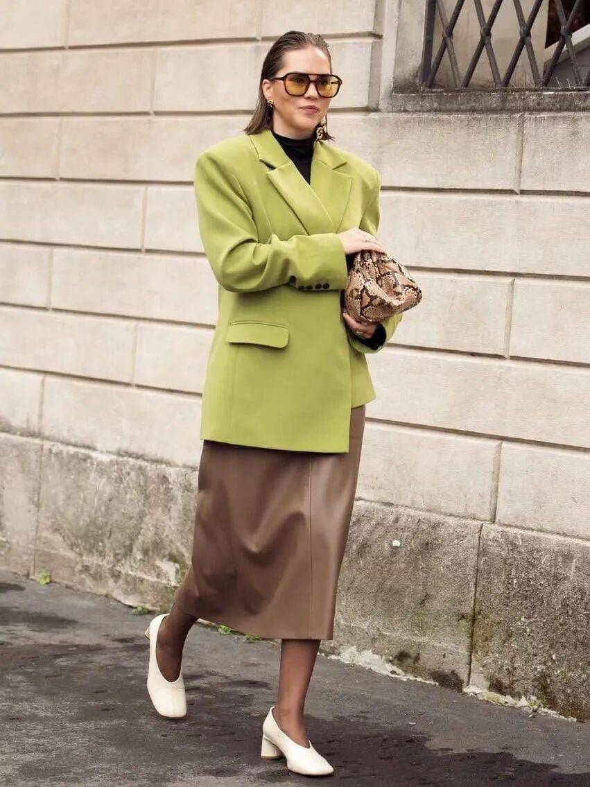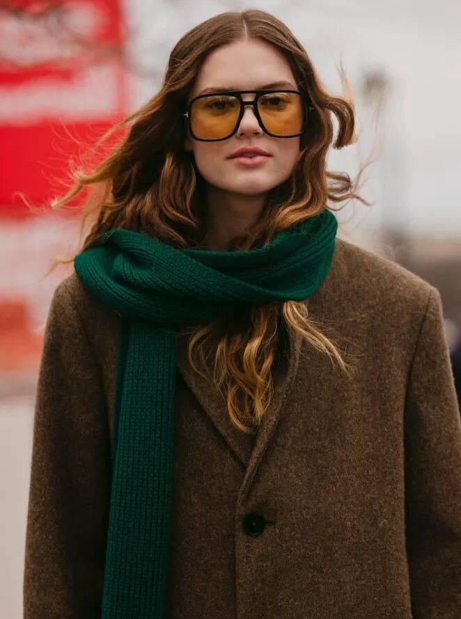 小面积点睛:棕色系穿搭中搭配绿色包袋/围巾
