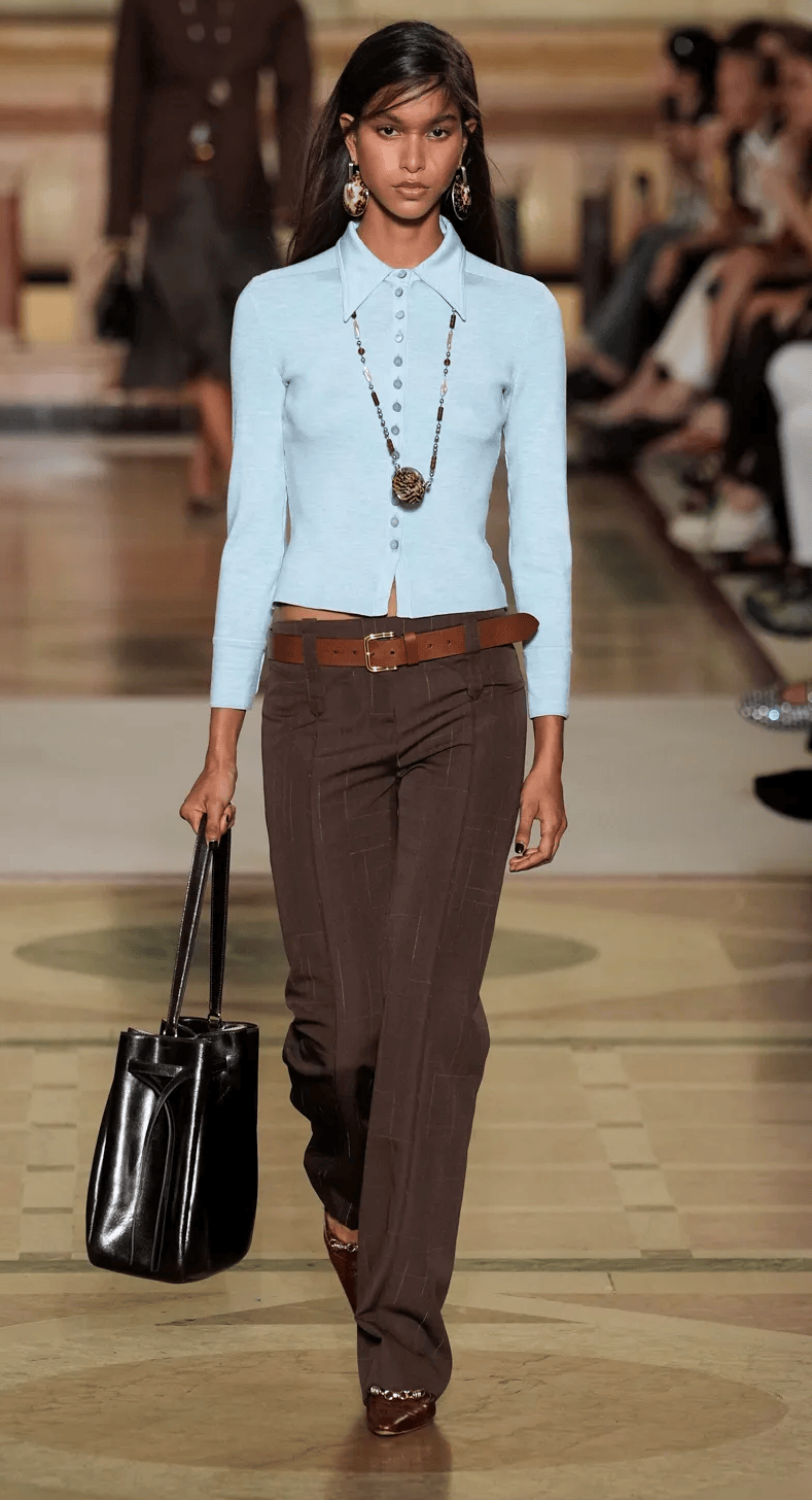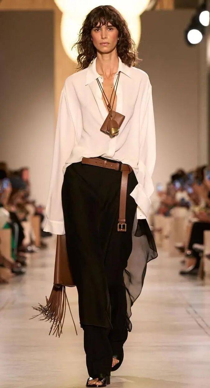 宝蓝真丝衬衫 + 深棕皮质阔腿裤