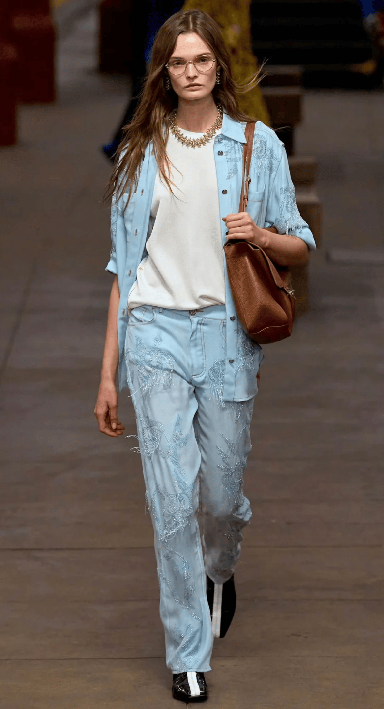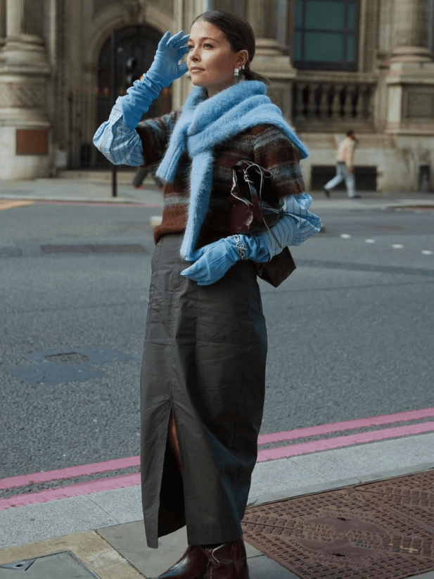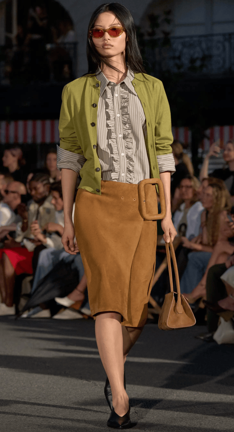 牛仔蓝衬衫 + 焦糖棕麂皮半裙