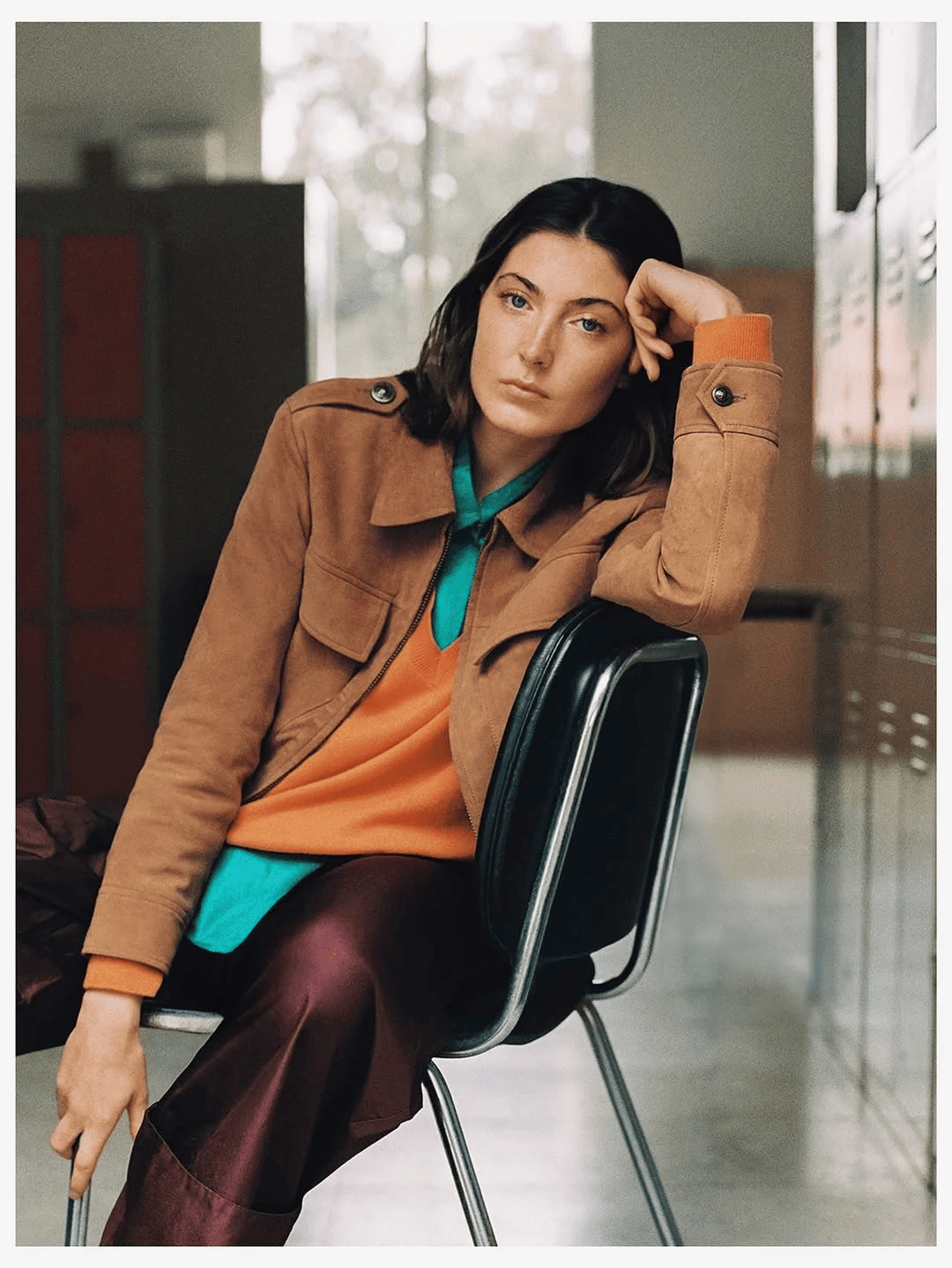 棕色皮夹克 + 军绿缎面连衣裙(柔光感面料弱化硬朗)