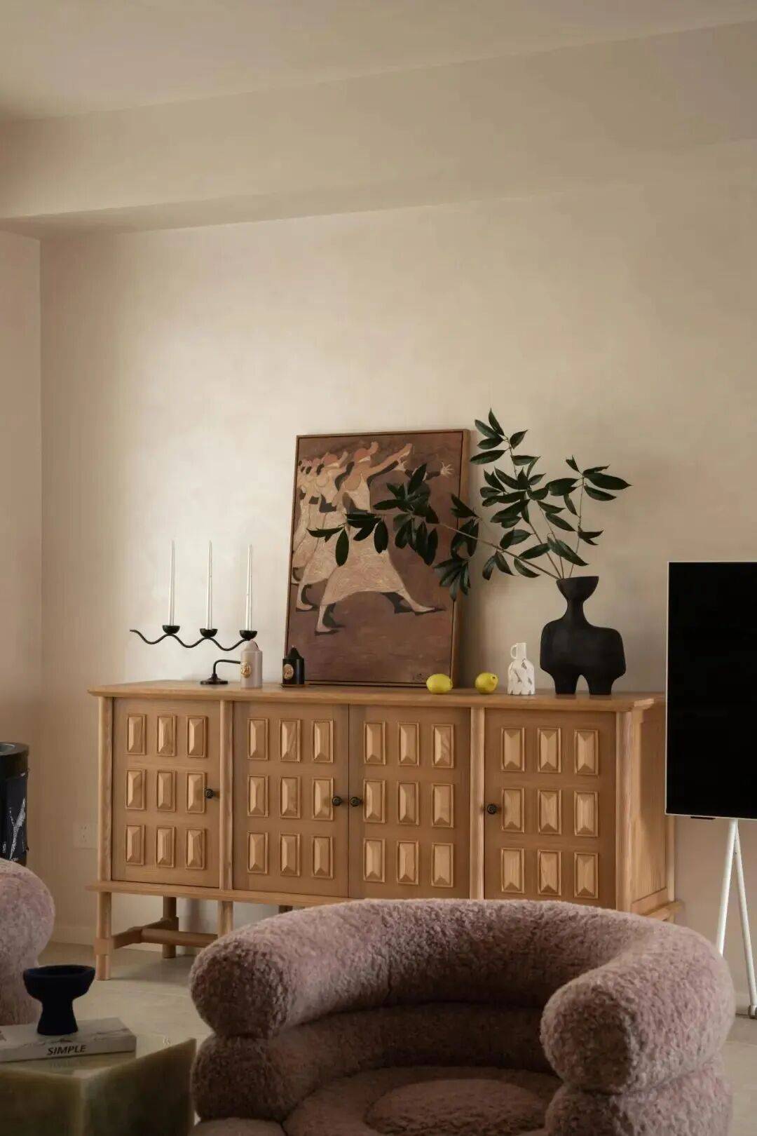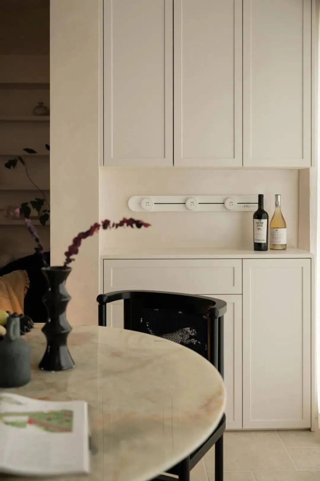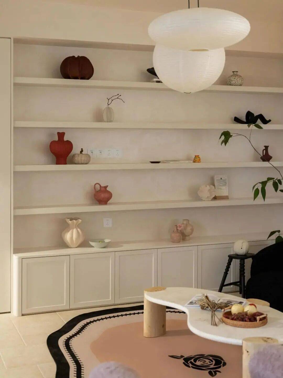 无电视墙客餐厅:以一体化置物架替代传统电视墙,展示妈妈收藏的绿植、陶艺与旅行纪念品,将空间转化为“家庭故事博物馆”。