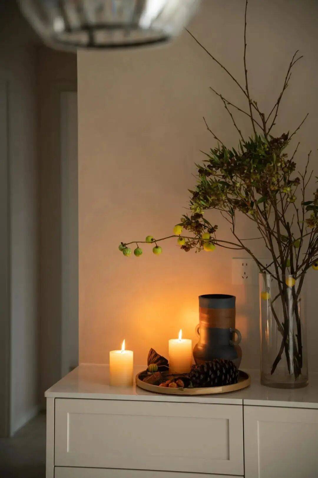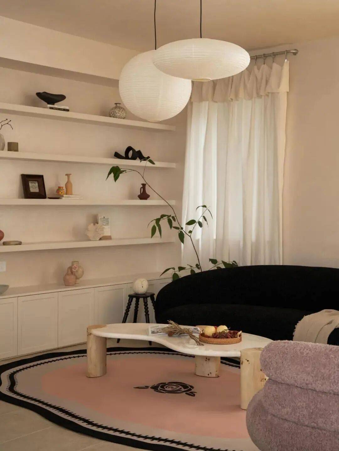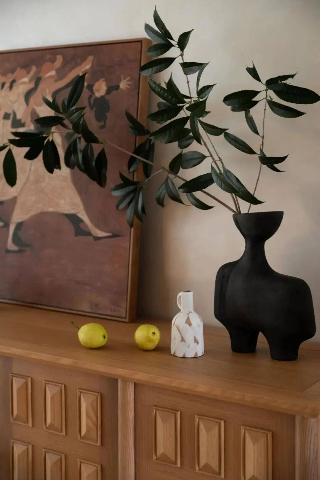 无电视墙客餐厅:以一体化置物架替代传统电视墙,展示妈妈收藏的绿植、陶艺与旅行纪念品,将空间转化为“家庭故事博物馆”。
