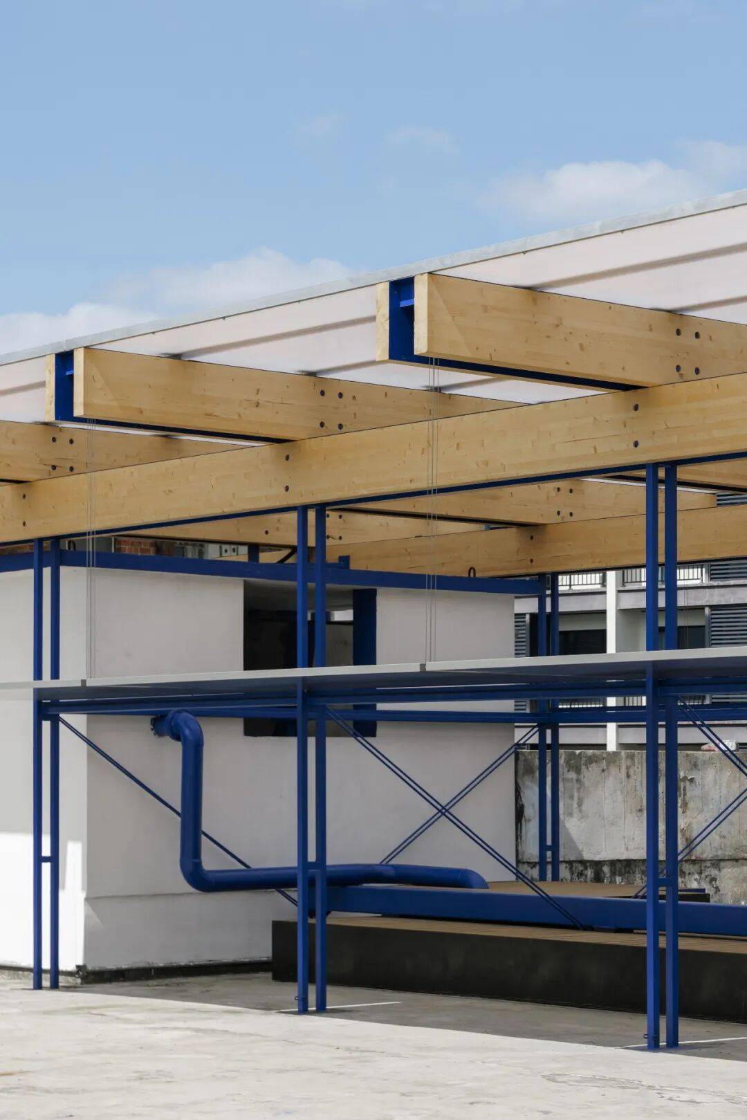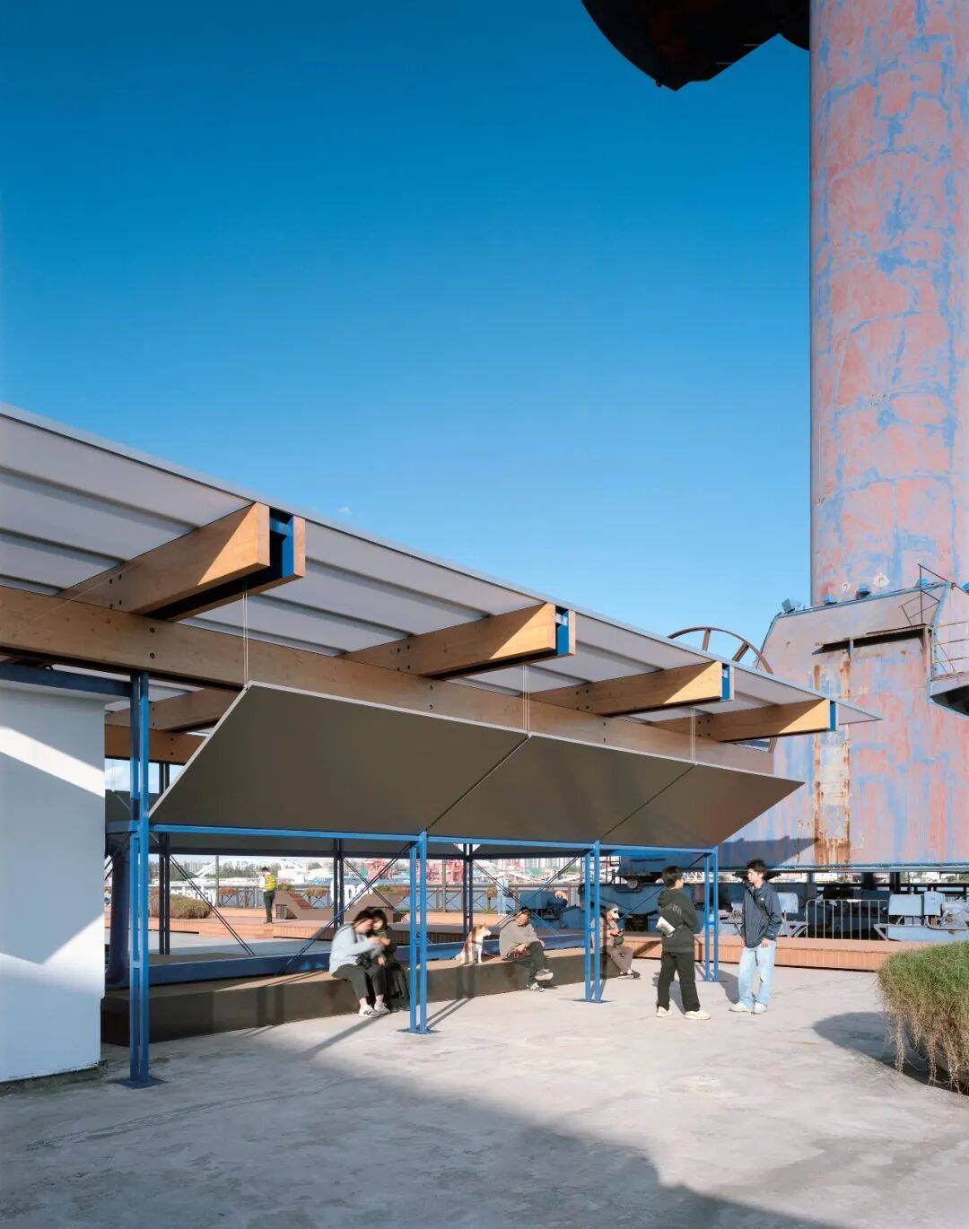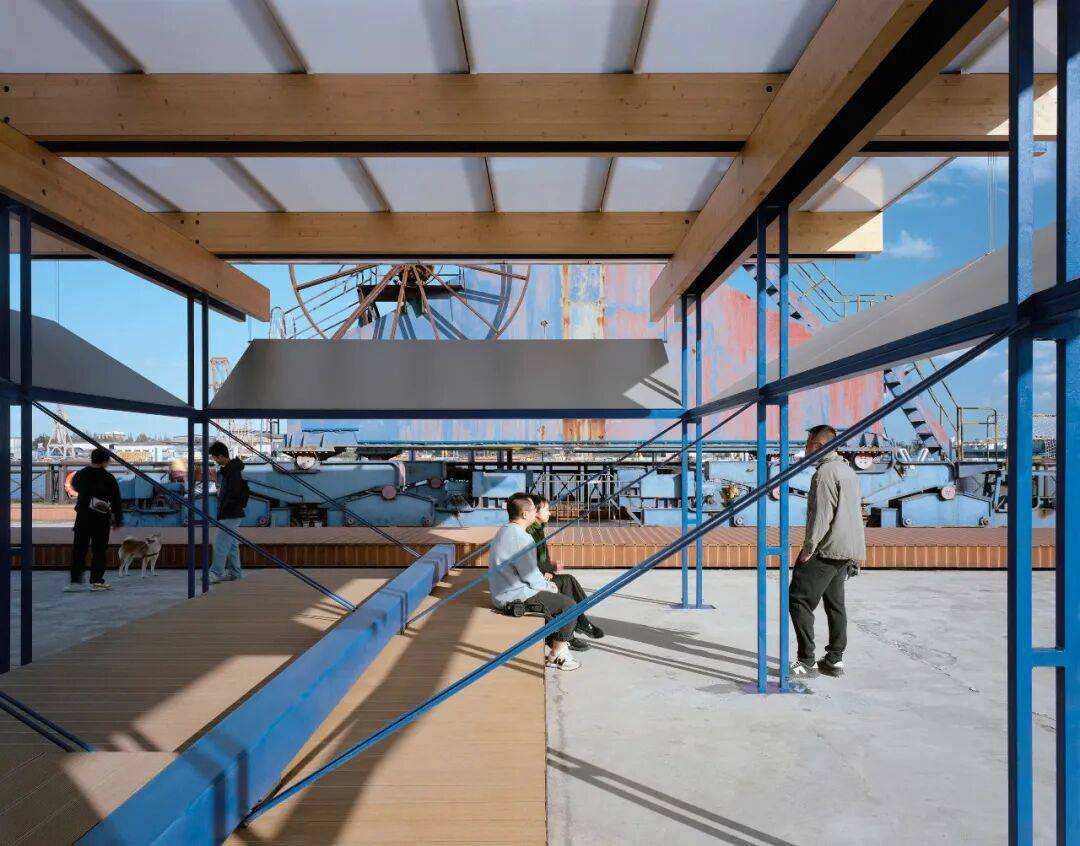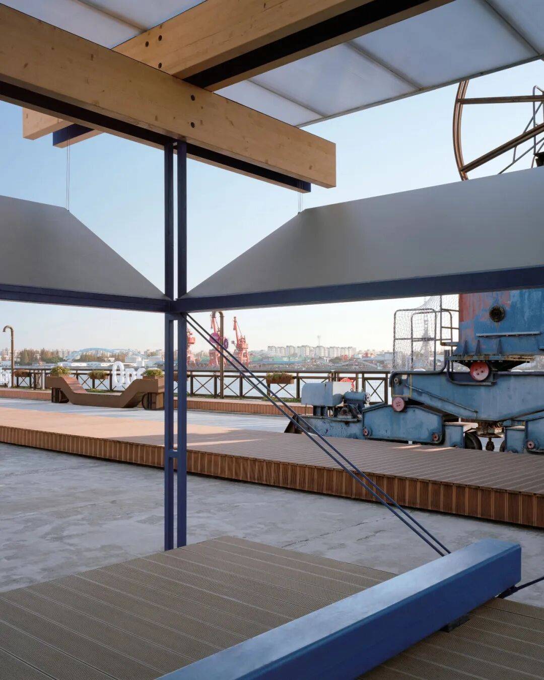 结构语言:以钢双立柱、胶合木双梁与悬吊舱板构建“悬浮船舱”,通过倒V形剖面与蓝色钢构件(普鲁士蓝)呼应船舶工业美学。