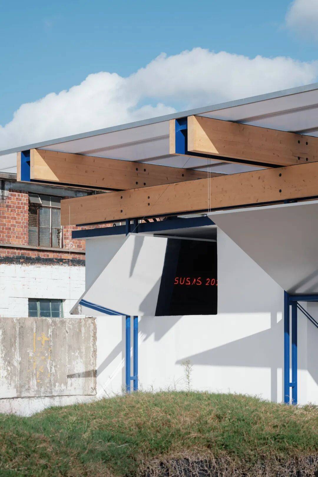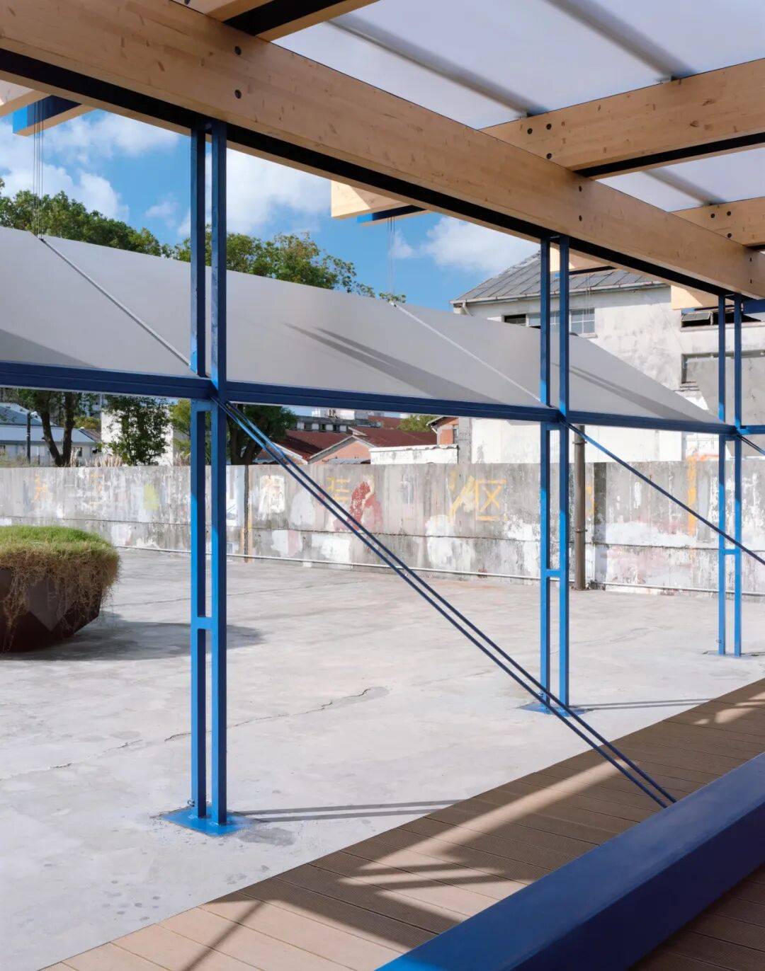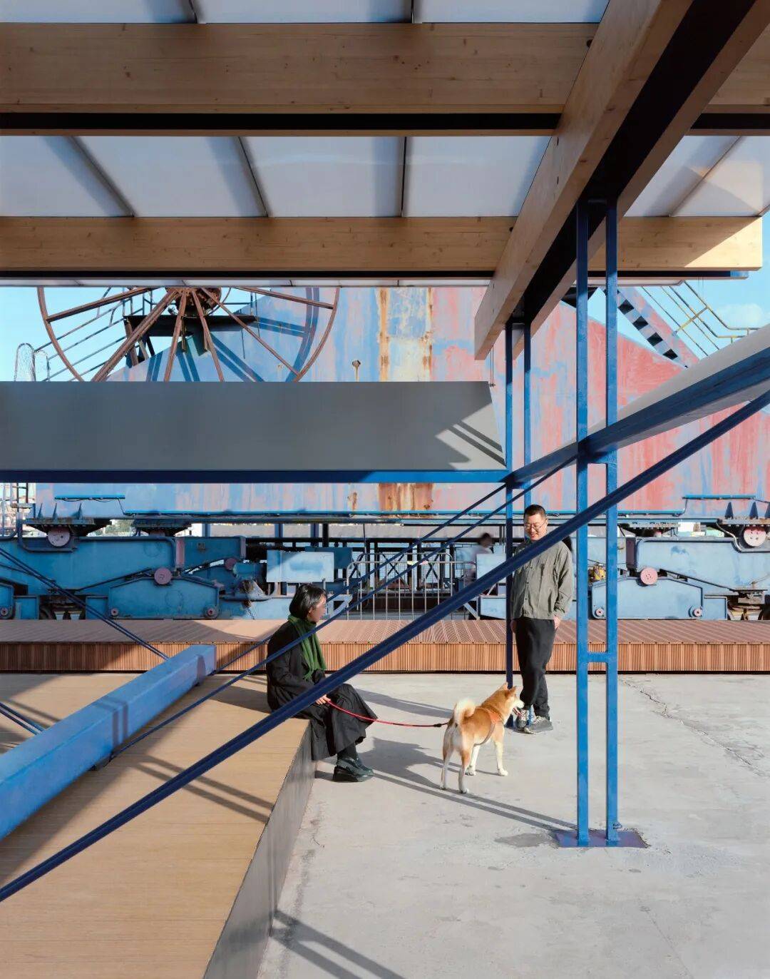 结构语言:以钢双立柱、胶合木双梁与悬吊舱板构建“悬浮船舱”,通过倒V形剖面与蓝色钢构件(普鲁士蓝)呼应船舶工业美学。