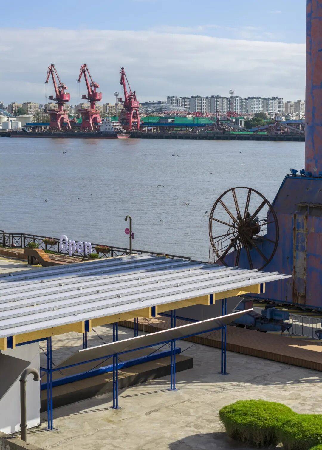 记忆驱动:紋建筑以复兴岛船台公园的工业遗迹为灵感,将高桩码头、造船塔吊、水泵房等元素转化为“浮舱”的架构语言。设计保留原始管道与检修台,通过钢构件与聚碳酸酯板重构“悬浮的船舱”,回应场地“静止却潜在可启动”的气质。