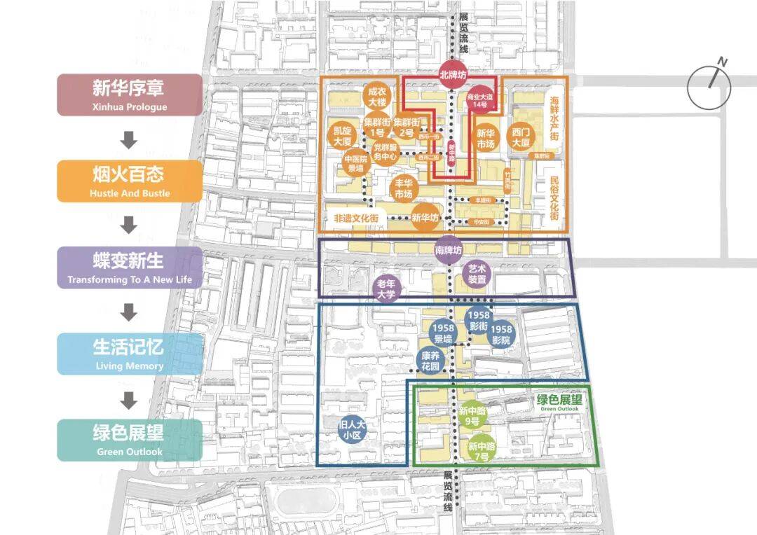 由新华市场、墟市、成衣大厦、水产街、对联街等新华特色商业组成为要展示场景还原上世纪60-90年代新华街道特色商业风貌,留存市井烟火气及城市自身的文化记忆。