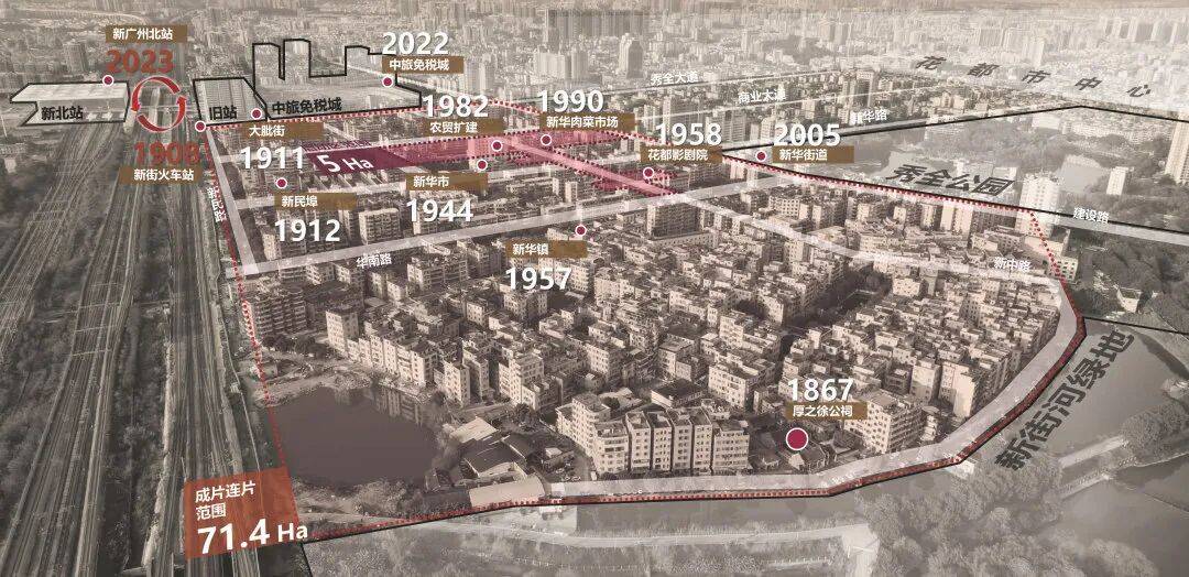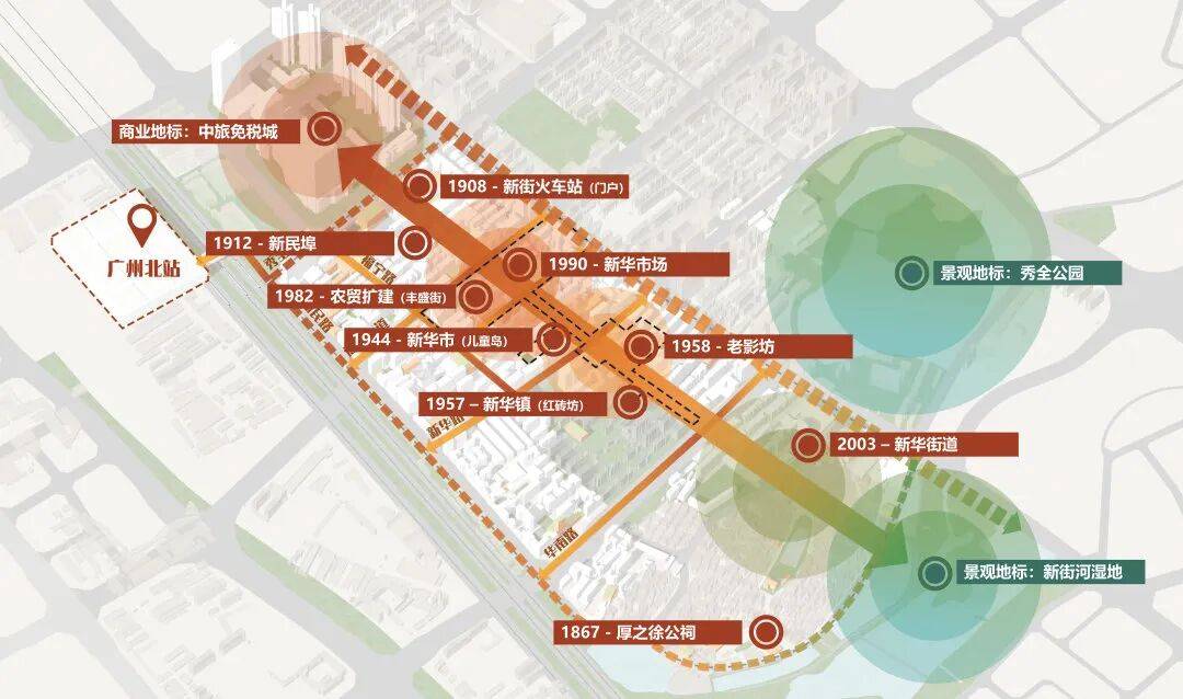 广州北站片区自上世纪八十年代逐步形成,贯穿南北的新中路是这片老城区最具烟火气息的主干道沿线分布着太子步行街、新华市场、1958 影院等具有时代特色的便民设施,这些场所不仅是居民日常生活的中心,更是几代花都人的集体记忆载体。