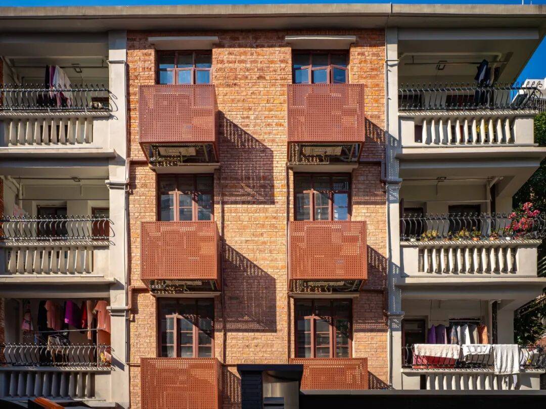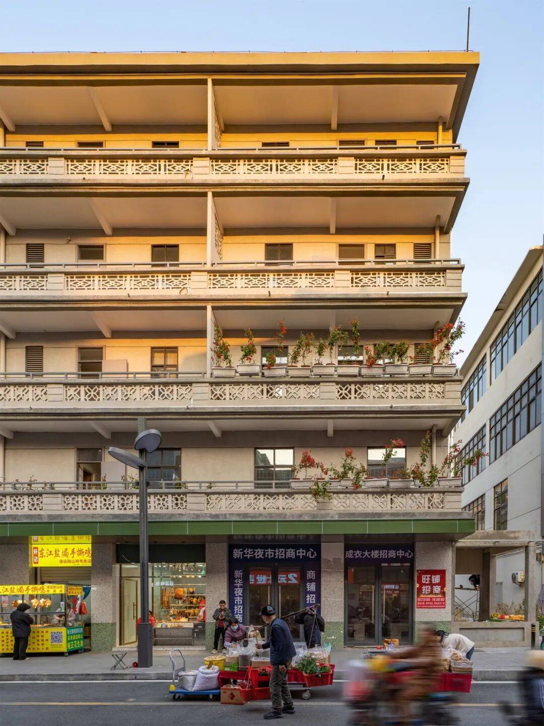 整治提升:对杂乱立面进行统一规整,植入现代材质的空调机位、雨篷与窗花元素;